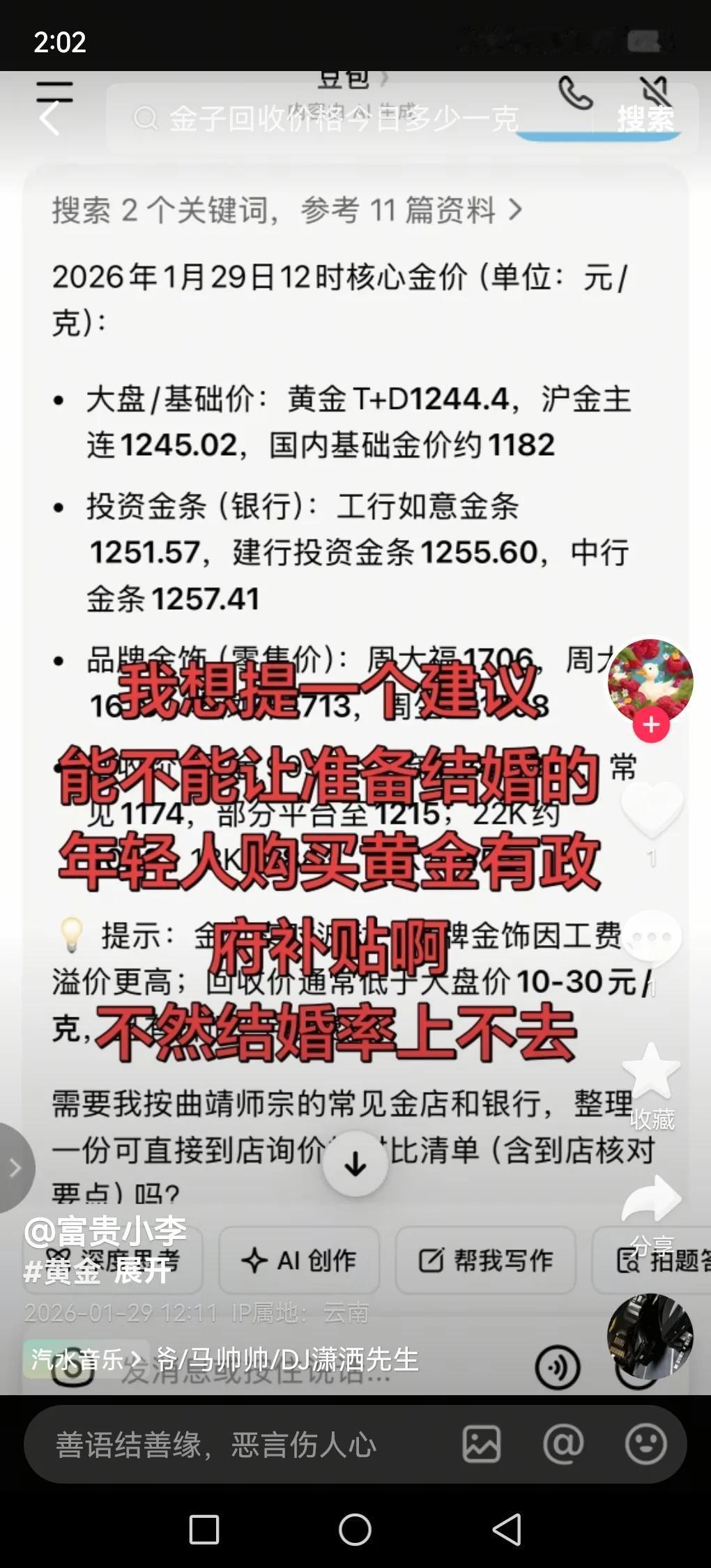 黄金暴涨真有可能影响结婚率。11月8日,COMEX黄金期货涨0.42%,现货黄金日内涨幅一度超1%。结婚买五金是很多地方的习俗,可金价这么涨,对不少新人来说就是沉重负担。 就说周大福,截至9月底零售点比3月底少了603家,这说明金价攀升下金店生意不好做。对年轻人而言,预算有限,买黄金要花不少钱。要是长辈还坚持买很多,小两口压力就更大了。幸福不该被黄金绑架,真没必要为了习俗让自己喘不过气。所以,黄金暴涨可能会让一些人推迟结婚,结婚率说不定就下降了。