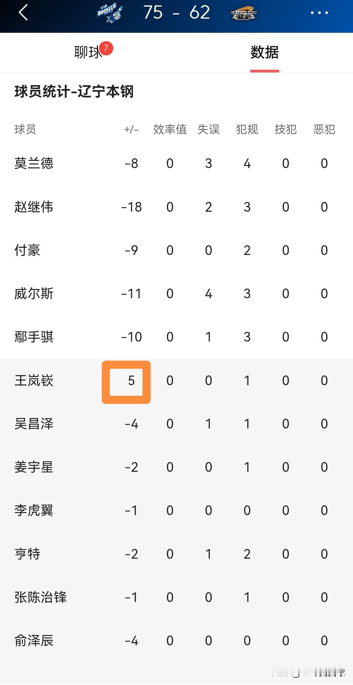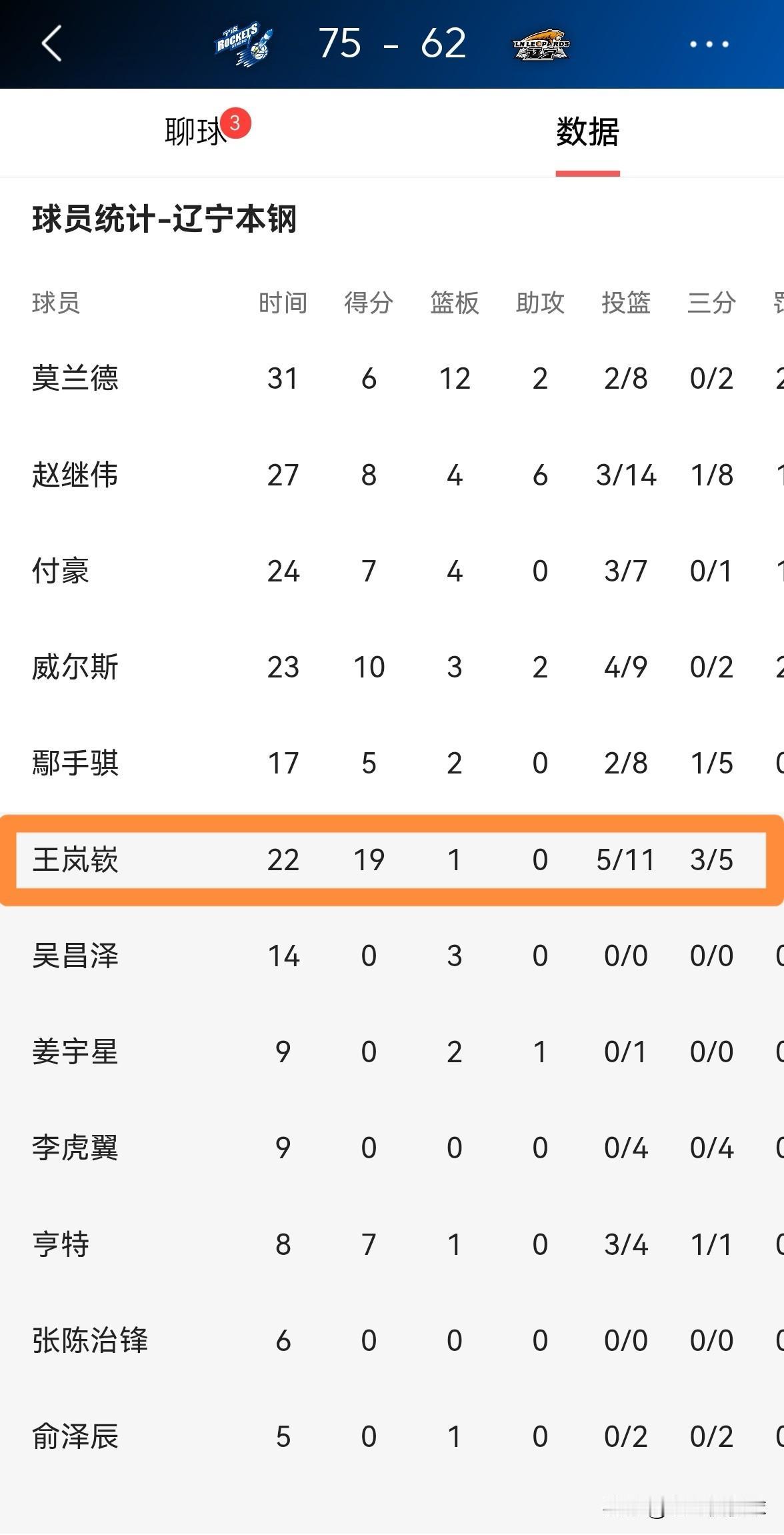 辽宁本钢大将王岚嵚真是虽败犹荣!虽然今天辽宁本钢在客场以62:75不敌宁波町渥,但是王岚嵚的表现却是非常出色,他在替补出战的22分钟里,投篮11中5,其中三分球5中3、罚球6中6得到19分1篮板1抢断,他的场上正负值不仅是全队最高的+5,而且是全队唯一的正值。 坦白说,以赵继伟目前的糟糕状态来看,乌戈教练应该果断的用王岚嵚取代赵继伟的首发位置,我相信王岚嵚打首发的效果一定会比赵继伟强的多。