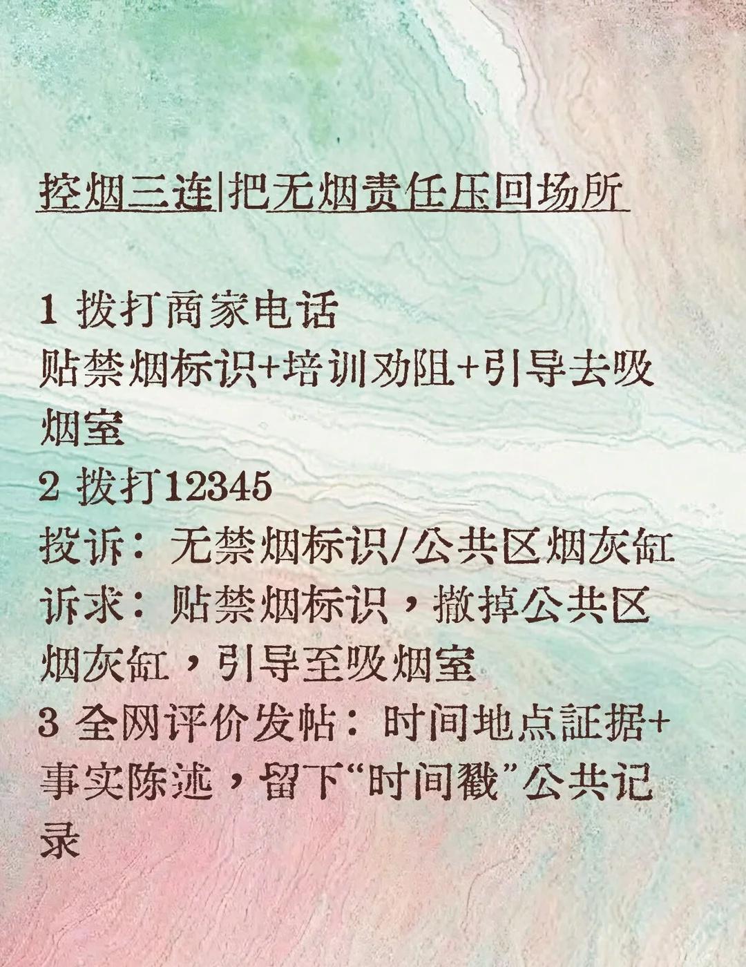 控烟三连:致电商家、12345 、全网评价发帖 很多时候,我们不是缺“愤怒”,而是缺一套低消耗、可复制、能留下证据链的控烟行动流程。 这套流程我称为 “控烟三连”:从“和烟民对线”转为“让场所承担管理责任”。 ① 拨打商家电话:先把“规则”立起来 直接问三个点: 1、是否在全区域张贴清晰的禁烟标识(入口、前台、走廊、休息区、卫生间等) 2、是否培训工作人员及时劝阻公共区域吸烟(不是“看见了再说”,而是有机制) 3、是否能引导吸烟者去吸烟室(明确:公共区域不允许抽) 目的:把“这家店到底有没有态度”说清楚,也给后续行动留一条可对照的记录。 ② 拨打 12345 投诉举报:把烟灰缸从公共区撤掉 当你发现:场所没有禁烟标识,甚至公共区域摆着烟灰缸,那就别再纠结“劝不劝得动人”,直接推动设施整改。 投诉要点可以这样讲: 1、场所内缺少禁烟标识 2、各公共区域设置烟灰缸等助推吸烟的设施 诉求明确: 1、撤除所有公共区域烟灰缸 2、仅在吸烟室保留烟灰缸 3、要求场所建立巡查与劝阻机制 逻辑很简单:烟灰缸=默认允许吸烟的信号。 你不需要“说服烟民”,你只需要让场所停止“提供便利”。 ③ 全网评价 + 全网发帖:留下“时间戳公共记录” 把它当作一条可检索、可引用的公共档案来写: 1、具体时间(精确到日期与时段) 2、具体地点(店名+门店地址/商圈) 3、证据与细节(拍环境:烟灰缸、烟味来源,工作人员回应记录,消费凭证等) 4、事实描述为主,少情绪词 5、提出明确诉求(禁烟标识、撤烟灰缸、巡查劝阻、引导去吸烟室) 这一条评价不是为了“发泄”,是为了给:商家、潜在顾客、相关部门留一条可追溯的公共参考。 结语 控烟这件事,最怕的不是“有人抽烟”,而是场所用烟灰缸、沉默、敷衍,把你逼回孤军奋战。 控烟三连的意义就是:让责任从“你个人的情绪消耗”,回到“场所必须履责的制度动作”。 控烟行动 二手烟治理 消费者评价权 12345投诉室内禁止吸烟 公共卫生 城市治理 无烟地图