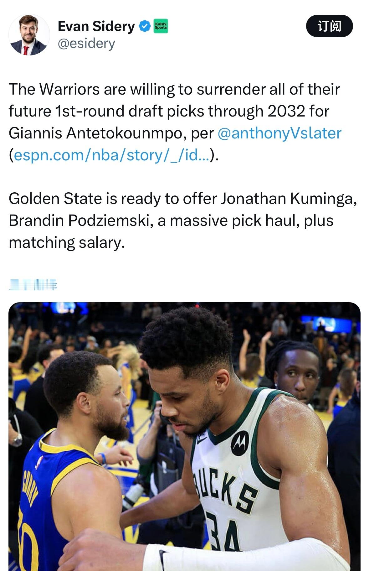 勇士梭哈?!😱勇士记者Anthony Slater:勇士队愿意为得字母哥,送出他们2032年之前的所有未来首轮选秀权。PS勇士筹码:四首轮:2026、2028、2030(1-20)和2032三个首轮互换:2027、2029和2031次轮签:两个