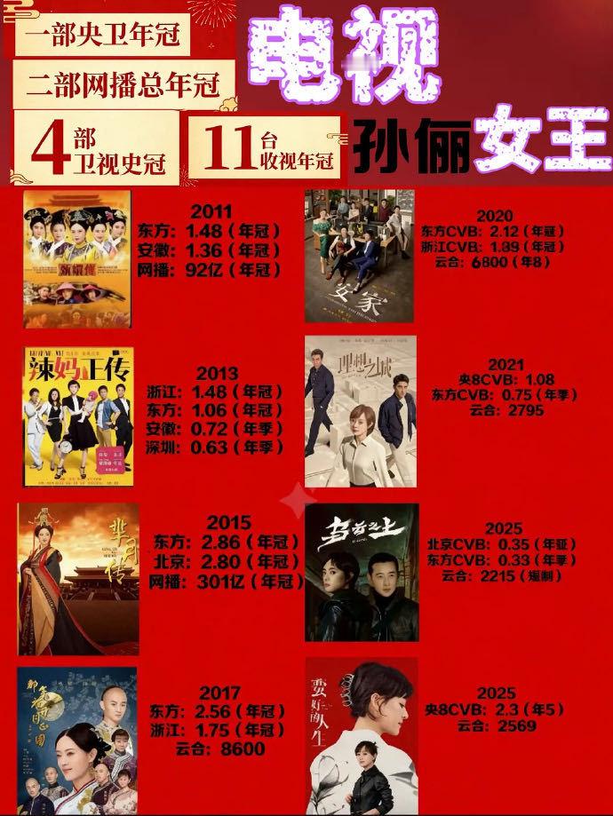 孙俪MVP结算画面胡曼黎非孙俪不可,视后非孙俪不可。收视做到央8官方认证的年冠,口碑做到“爱上胡曼黎像呼吸一样简单”,热度做到微指7.5亿历史前五,真真撑得起一句“年度女演员”,用演技让胡曼黎成为2025这一整年最出彩、也最有生命力的角色。孙俪得奖,全网都在恭喜的含金量谁懂?观众缘全年龄段能打,她的剧是能让一家老小都被“硬控”在电视机前一起看的实力。作为最年轻的大满贯视后,一出手就将总台视后收入囊中,手握4部卫视史冠、11台收视年冠,回看孙俪的播剧史,出现频率最高的两个字就是——冠军,而且从不需要任何限定词。商业价值与演技长期并行,只要她确认出演,就是品质与收视的保证,大演员的气场让她在选角上也是内娱独一份,对角色和故事的驾驭能力极其稀缺,真正意义上的六边形战士。视后今年还有两部待播作品,一部情感pua,一部奇幻悬疑,又是突破以往的新题材新角色,已经开始期待孙俪又会把我们带进怎样的演技大赏里。
