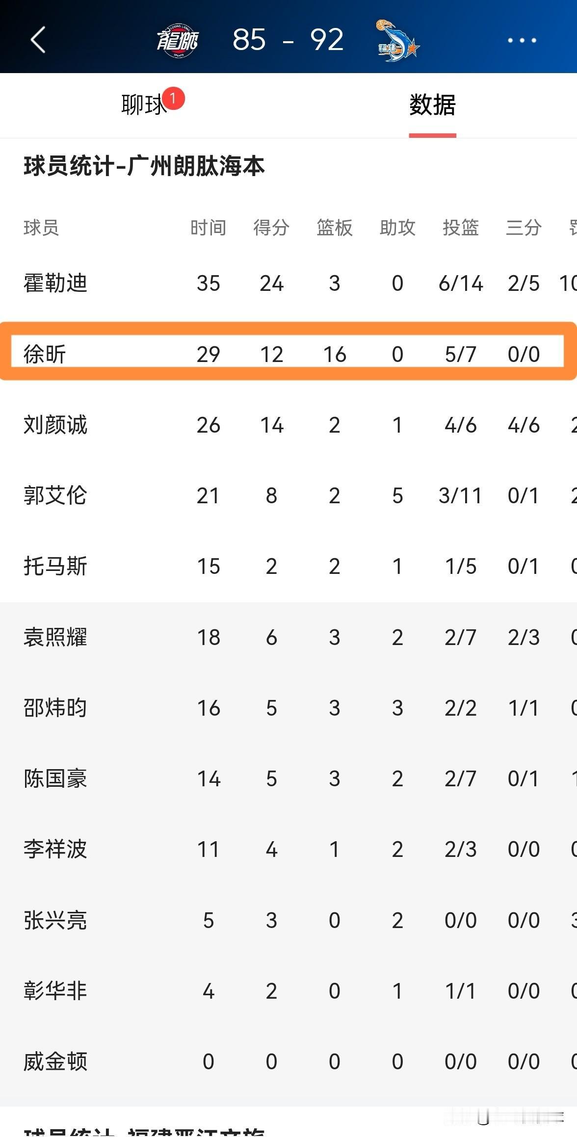 广州朗肽海本新星徐昕真是一个篮下大杀器!虽然今天广州朗肽海本在主场以85:92不敌福建晋江文旅,但是徐昕在篮下展现出了超强的统治力。 全场比赛下来,徐昕首发出战29分钟,投篮7中5,其中罚球2中2非常高效的砍下12分16篮板2盖帽,其中包括6个前场篮板。 毫不夸张的说,以徐昕目前的进步速度来看,不出三年他一定能够在篮下统治CBA。