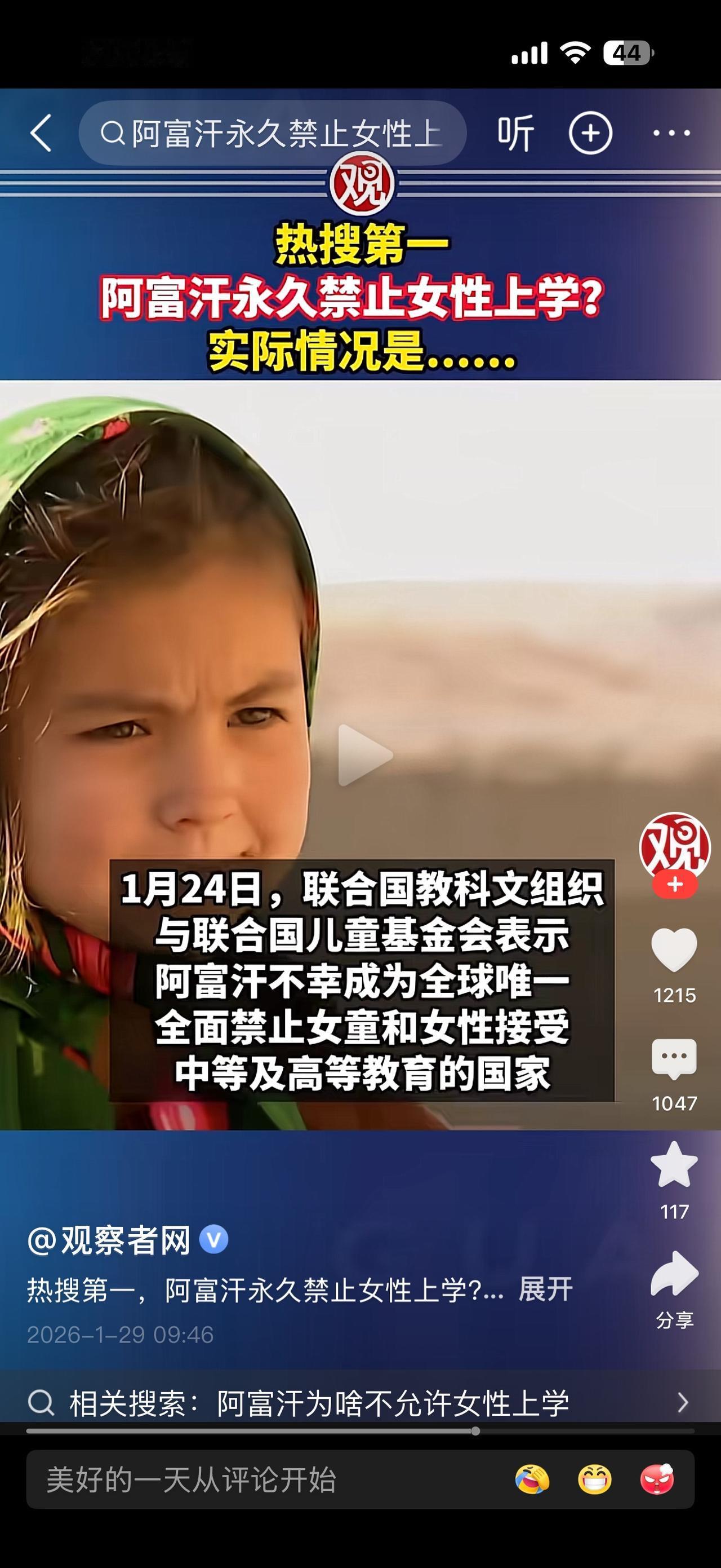 《观察者网》的切入点值得商榷!希望做一个有良知的媒体! (欢迎关注点赞支持) 2026-1-29观察者网发布一条给塔利班辟谣的新闻:意思是前几天引起热议的,塔利班不允许女性上学是“谣言”,塔利班教育部长的讲话并没有禁止女性接受教育,因为塔利班允许女性接受小学教育! 我就奇怪了,该媒体的切入点是不是有点“偏”?难道因为阿富汗塔利班政府,允许女性可以读到小学毕业,就可以忽视他们反人类、践踏基本人权的行径吗? 塔利班不许女性接受中等、高等教育,不允许女性工作,这本身就是反人类的行为,本来就应该大力谴责和批评!对于这种政权有什么好“洗”的?