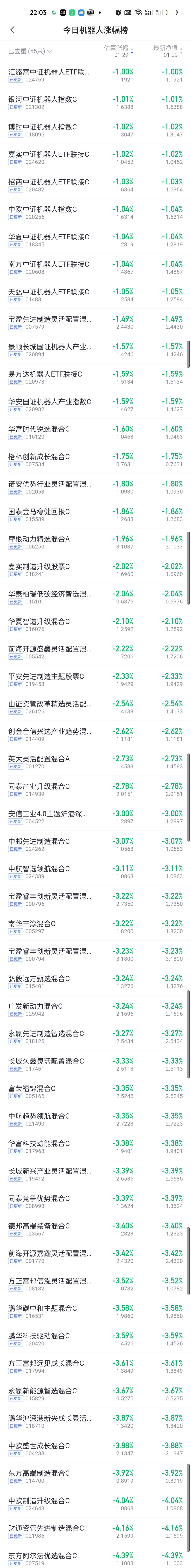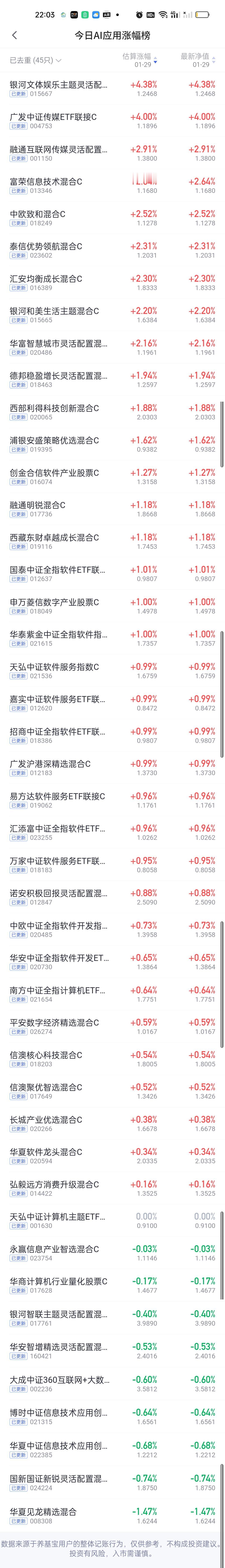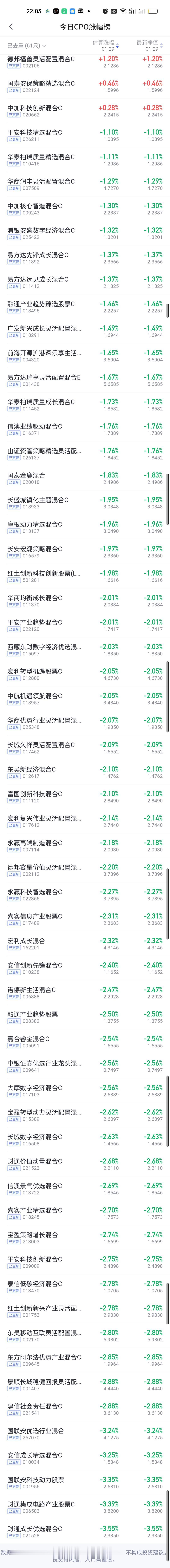 今日基金净值榜已全部更新完毕。今天的冠军是一颗双黄蛋,招商中证白酒和格林稳健价值以9.21%的收益率并列第一,鹏华酒指数8.56%排名第二,融通新消费7.65%排名第三,天治转型升级7.42%排名第四,华商消费行业股票7.01%排名第五,这也是今天收益率在7%以上的全部六只基金。 跌幅方面,东方阿尔法科技优选6.29%排名第一,汇安趋势动力股票5.49%排名第二,汇添富竞争优势5.31%排名第三,金信精选成长5.04%排名第四,金信稳健策略4.94%排名第五。 商业航天,AI应用,CPO,机器人,创新药涨幅榜一并奉上!