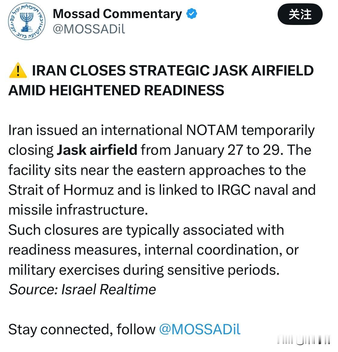 突发消息,伊朗在高度戒备状态下关闭战略要地贾斯克机场 伊朗发布国际航行通告,暂时关闭贾斯克机场,时间为1月27日至29日。该机场位于霍尔木兹海峡东部入口附近,与伊朗伊斯兰革命卫队的海军和导弹基础设施相连。 此类关闭通常与敏感时期的战备措施、内部协调或军事演习有关。