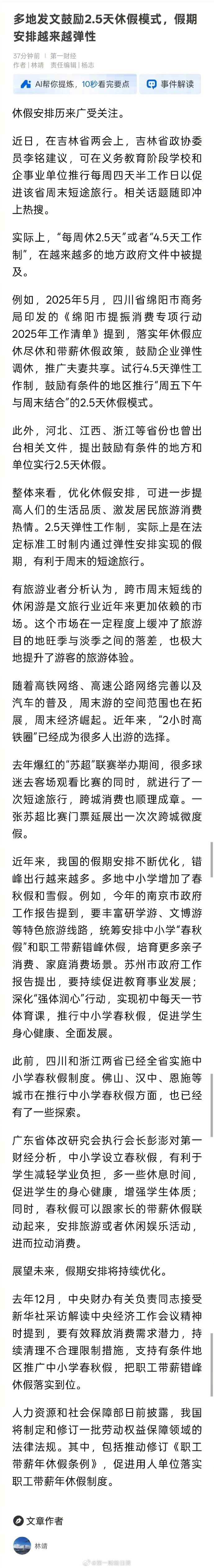 #多地发文鼓励每周休2.5天#【#多地发文鼓励2.5天休假模式#,假期安排越来越弹性】休假安排历来广受关注。近日,在吉林省两会上,吉林省政协委员李铭建议,可在义务教育阶段学校和企事业单位推行每周四天半工作日以促进该省周末短途旅行。相关话题随即冲上热搜。实际上,“每周休2.5天”或者“4.5天工作制”,在越来越多的地方政府文件中被提及。例如,2025年5月,四川省绵阳市商务局印发的《绵阳市提振消费专项行动2025年工作清单》提到,落实年休假应休尽休和带薪休假政策,鼓励企业弹性调休,推广夫妻共享。试行4.5天弹性工作制,鼓励有条件的地区推行“周五下午与周末结合”的2.5天休假模式。此外,河北、江西、浙江等省份也曾出台相关文件,提出鼓励有条件的地方和单位实行2.5天休假。(一财)网页链接