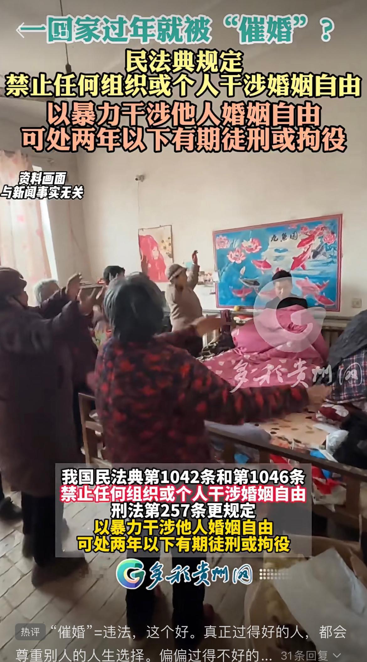一回家过年就被“催婚”?民法典规定,禁止任何组织或个人干涉婚姻自由。以暴力干涉他人婚姻自由可处两年以下有期徒刑或拘役。 催婚 违法