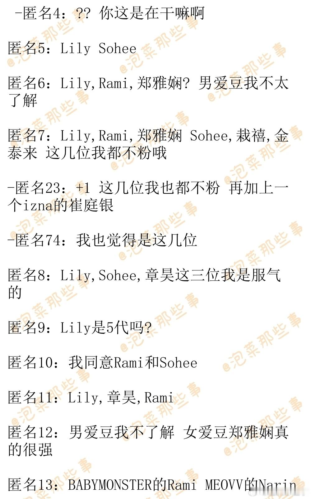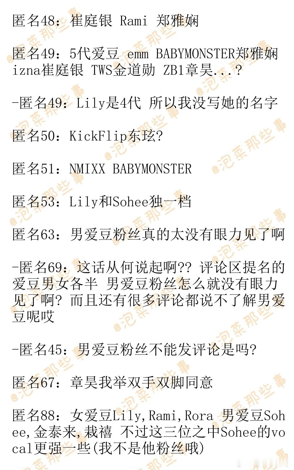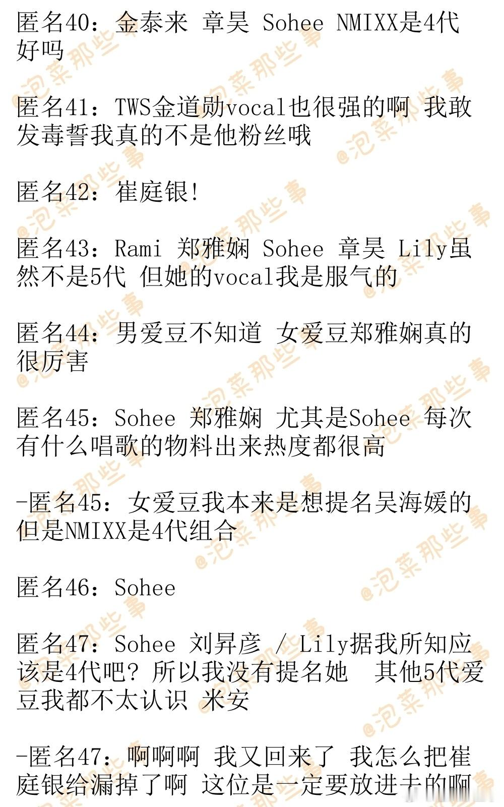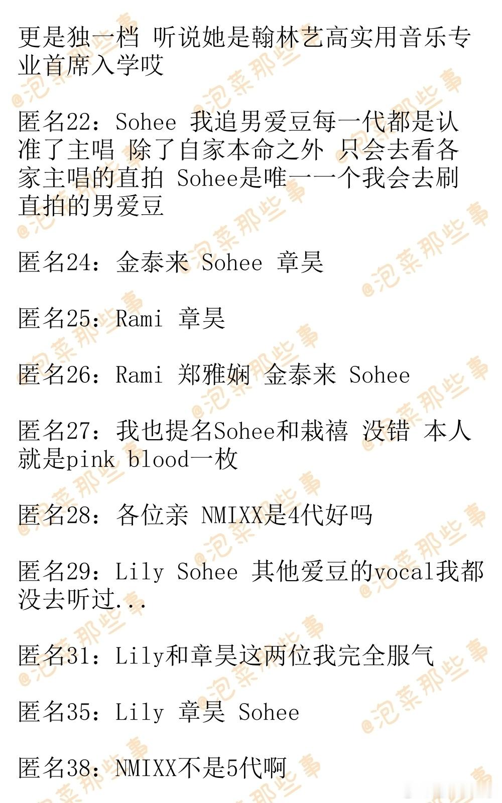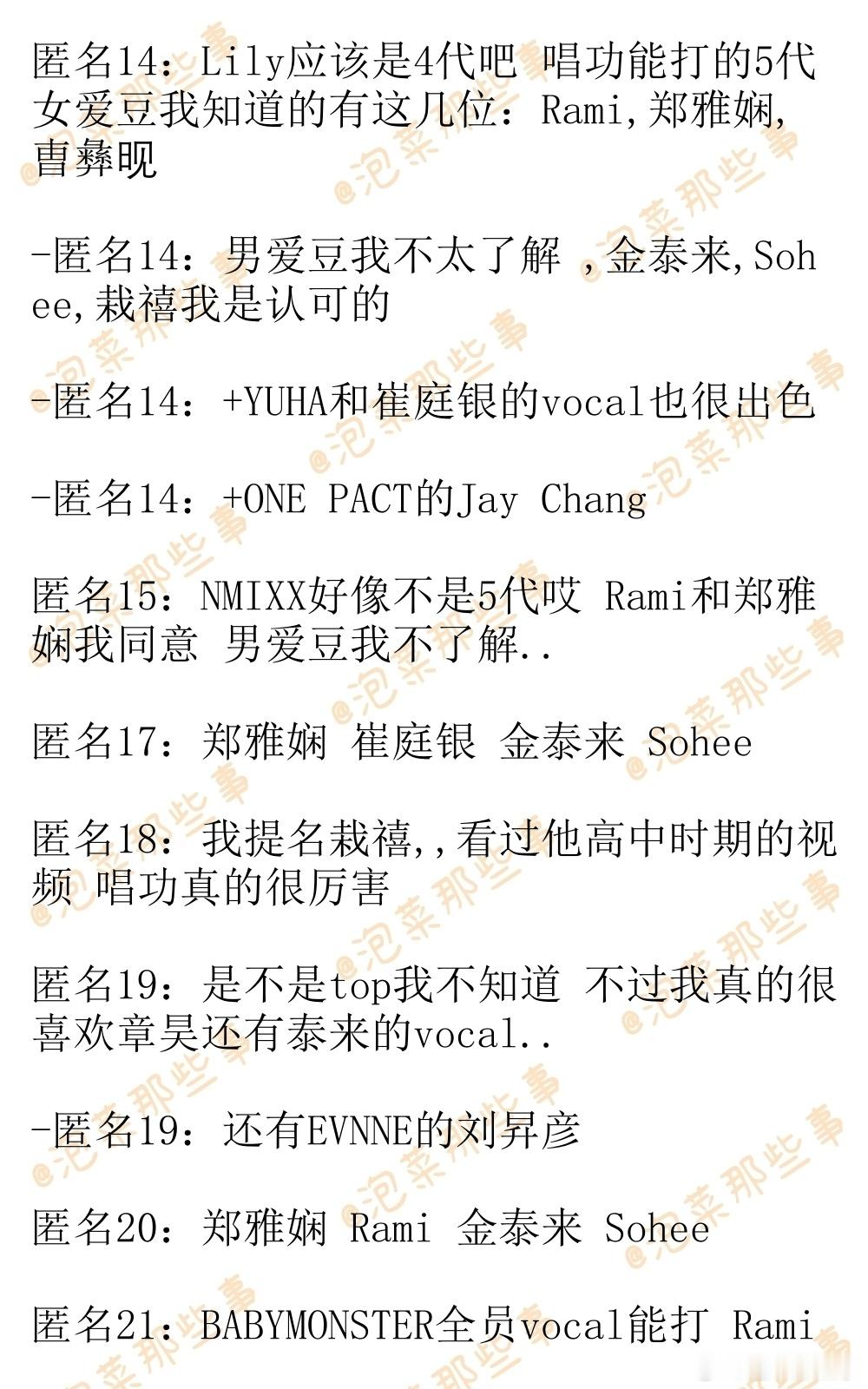 🔥韩网热帖评论翻译🔥5代男女爱豆vocal top3你觉得分别是谁啊?韩网原帖帖主发问:5代男女爱豆vocal top3你觉得分别是谁啊? 我只知道NMIXX的Lily?RIIZE的Sohee?ZB1的章昊?这三位 cr.instiz