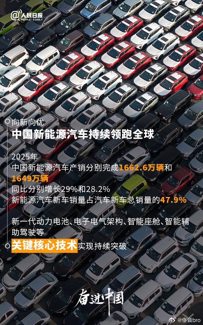 中国新能源汽车持续领跑全球2025年,新能源汽车产销分别完成1662.6万辆和1649万辆,同比分别增长29%和28.2%,中国新能源汽车已经走过了“堆车型、价格战”的低质内卷阶段,正式进入了“定技术、拼标准”的高质量发展期。 从 47.9% 的市占率到 72.1% 的 AEB 普及率,我们看到的是一个技术自立、安全兜底、品牌向上的成熟产业。中国新能源汽车向新向优大v聊车