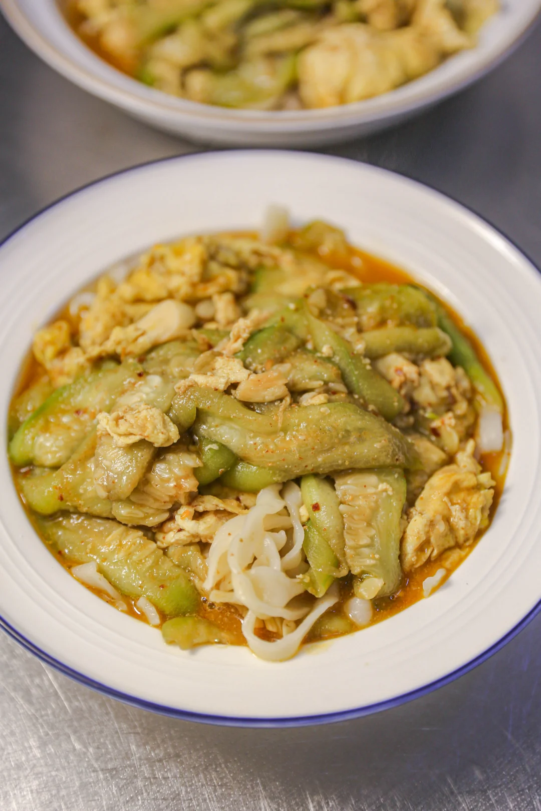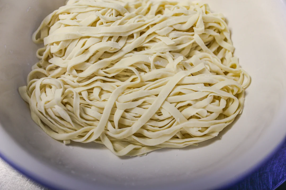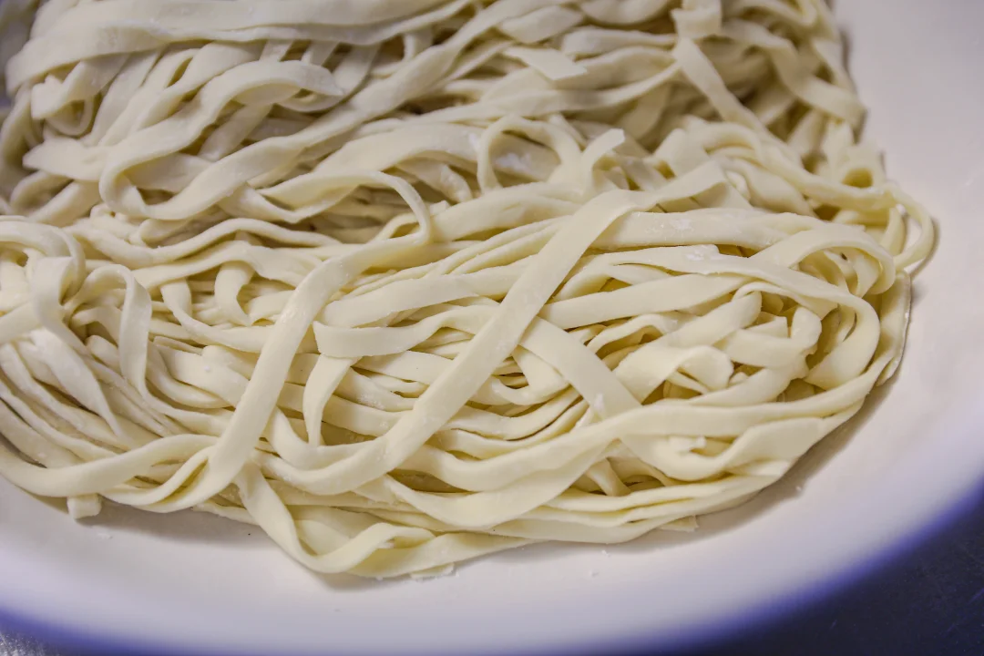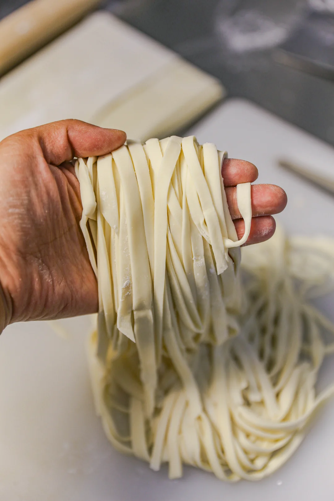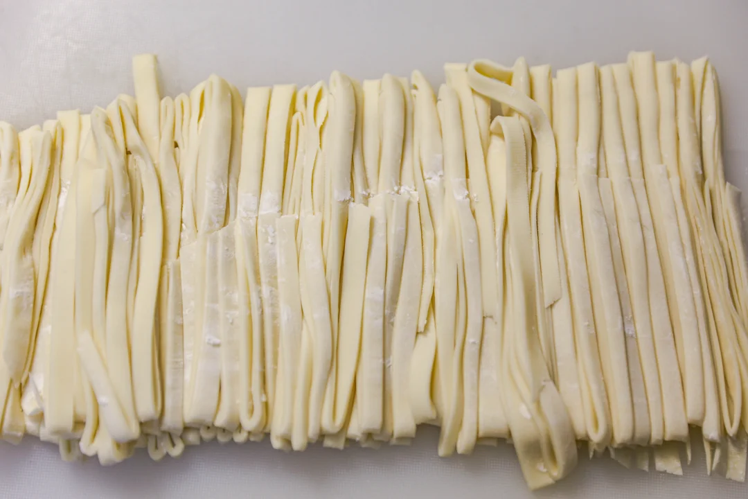 2️⃣:醒好的面团用擀面杖擀成厚度大约0.3公分的片状,折叠起来,用刀切成宽约1厘米足有的面条,醒发过的面条非常有筋性,你也可以用手从面条两端拉长,拉成自己喜欢的面条长度即可。
