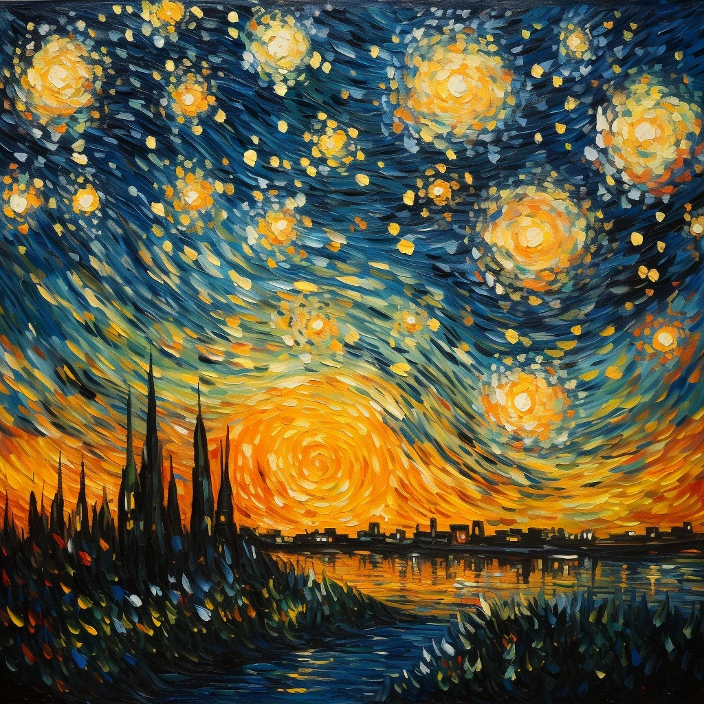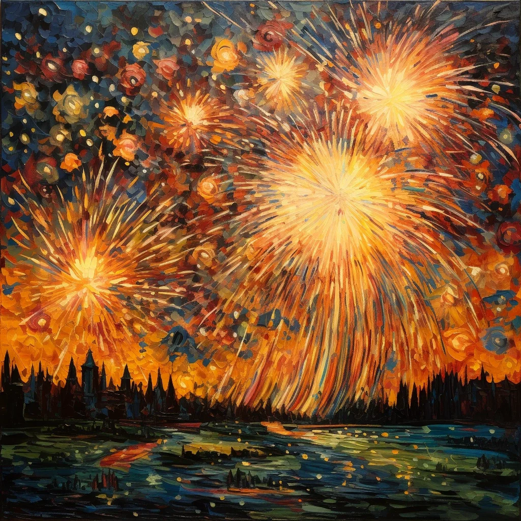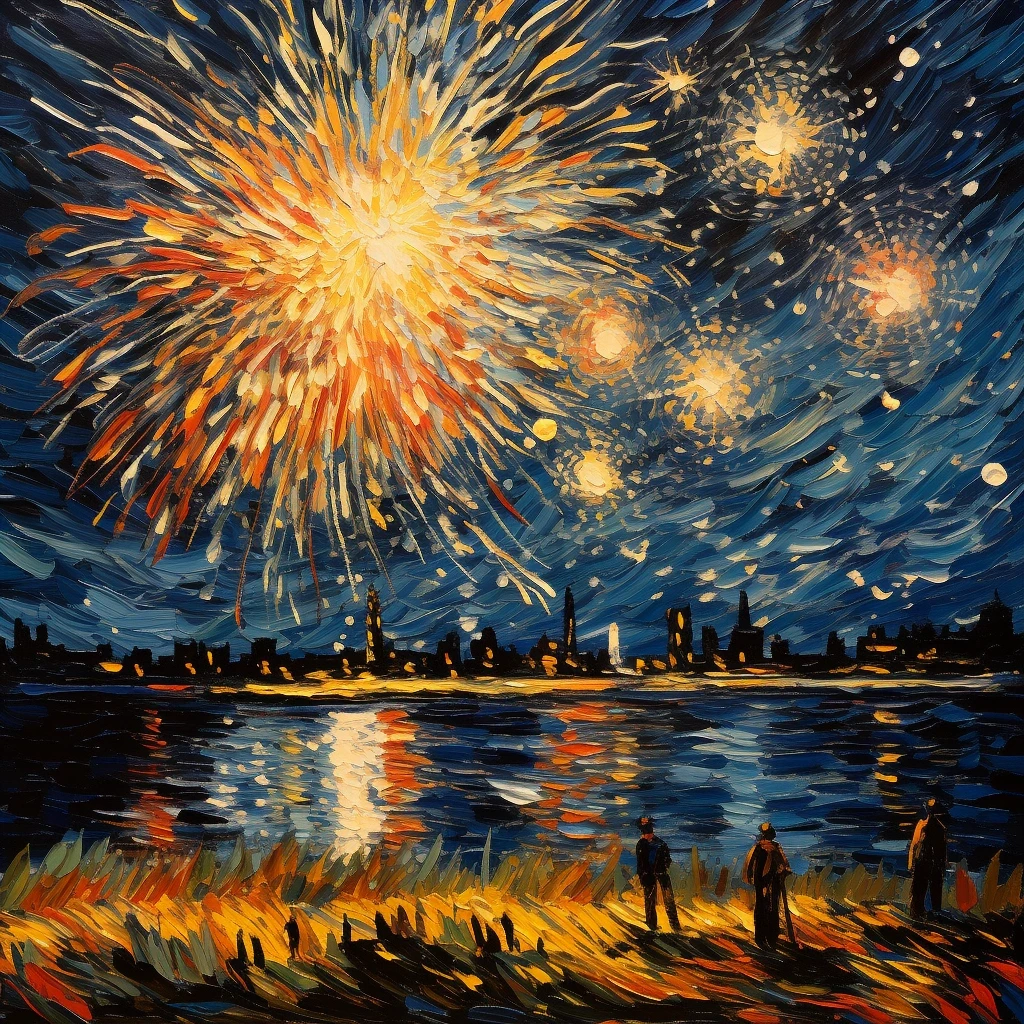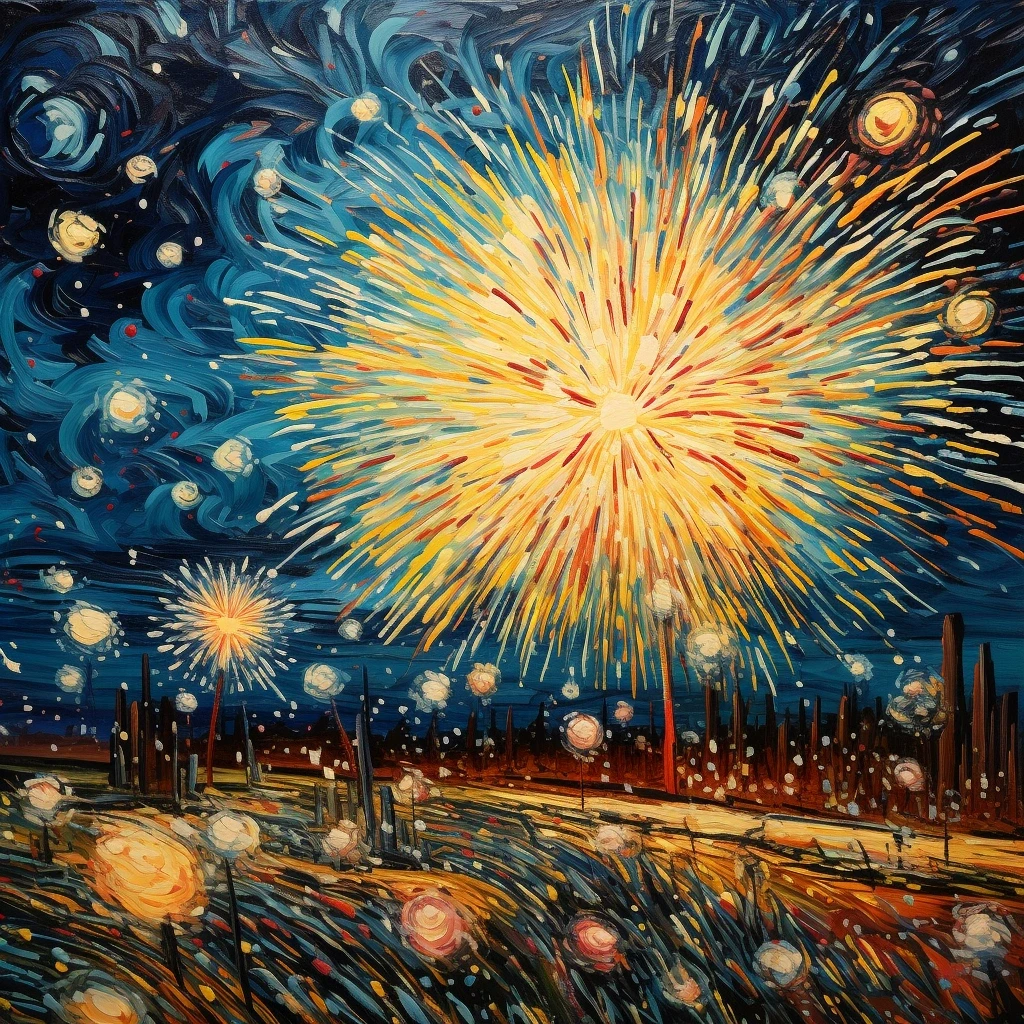 纷纷灿烂如星陨,赫赫喧豗似火攻 烟花 梵高 水彩 midjourney AI 向烟花许个愿 油画 水彩和油画混搭,各有各的特色。