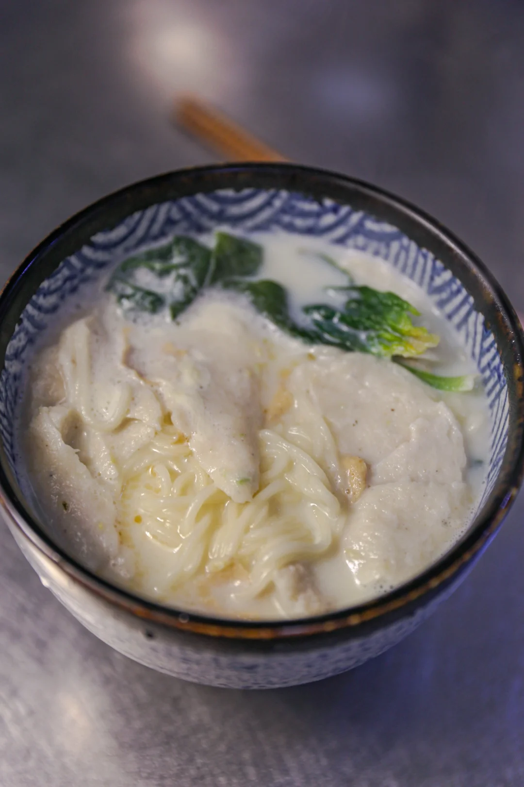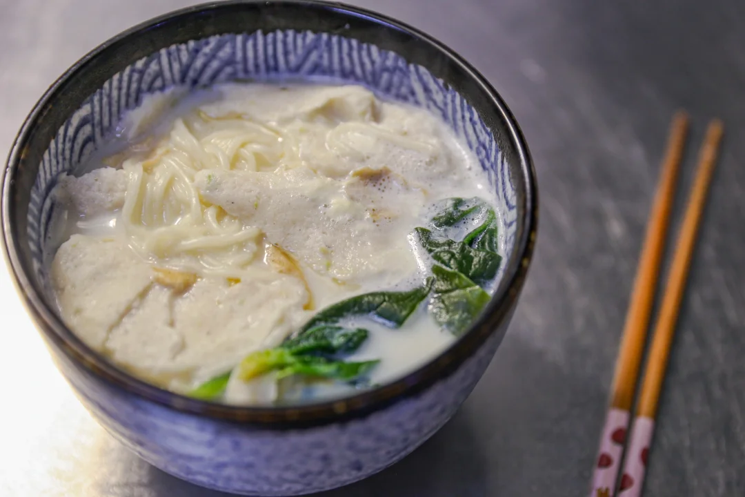 在这一碗面里面,你可以喝到浓浓的豆浆,豆浆和鱼丸的搭配,大大增加了鲜味,提升了整个面条的口感和营养。 豆浆可以选择购买现成的,也可以用豆浆机或者料理机现打,打好后用筛子过滤一下,太多的豆渣可在煮面的时候容易糊底,也影响口感。 做起来非常简单,所需要的调料只有盐和白胡椒粉。 豆浆放入锅中,加入鱼片或则鱼丸,煮熟后,加入食盐和黑胡椒粉即可。 面条另外用一个锅煮熟。 碗中放一点芝麻油,将煮熟的面条放入碗中,加入豆浆鱼丸汤,撒上香菜和葱花即可。
