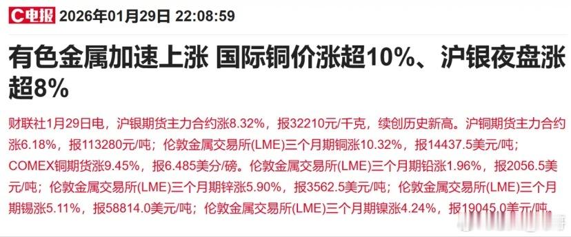 a股市场盘后筛选出来的几个重要的消息面:一是有色金属仍在继续大涨,国际铜价涨超10%,沪银夜盘也继续上涨。国际黄金价格涨幅虽然有所放缓,但是白银疯狂挡不住了,伦铜价格也出现暴涨;这场大宗商品以及有色金属的牛市还在继续疯狂中,至少目前金属价格还在继续上涨;二是中国银行发布消息,调整白银延期合约业务参数,保证金比例上调,提示投资者要提高风险意识;白银价格持续飙涨,保证金比例开始提高,这也算是一种人为的风险调控行为,不过能否有效还得看国际金属价格表现;三是四川黄金发布公告,第三大股东在过去的两个交易日合计减持超百万股;最近黄金股大涨,大股东也是精准的高位减持,不得不说也是赶上了好时候,公司大股东之前就公布要减持,现在真的是天时地利人和配合了。这种现象之后会不会在其他高位热门题材股上发生?这个还真的不好说,因为这一幕炒作上去之后的减持,商业航天里之前也出现过。四是石油基金LOF(160416 )公告,将于2026年1月30日开市起至当日10:30停牌,自2026年1月30日10:30复牌;今晚多只石油基金LOF宣布停牌,主要还是担忧美伊局势升温,今晚国际原油价格也出现了大幅上涨的情况。从今晚的消息面来看,关于有色金属的消息有利好也有利空,但我看到的更多的还是价格上涨的疯狂。很明显这一波有色金属涨价已经到了挡都挡不住的地步了,长期来看有美元指数走弱的背景,短期又有地缘局势紧张的催化,而随着价格越涨越高,很明显吸引了不少增量资金入场去参与周期有色了。所以,现在这种疯狂可以说已经超乎大多数人的预期了,这个时候大家也不要问我风险和机会如何,我觉得任何猜测已经没有意义了。或许这个时候很多人会提示风险,但是这个风险不一定就会按照提示的一样出现,有些人提示的所谓风险,也可能会是在挡住一些人去赚钱。因为我们自身是控制不了金属价格的上涨的,对于一个我们都无法控制的国际价格行为,所有的猜测都没有任何的意义,只能是应对,不能再去做预判了。我现在唯一确定的就是,越是疯狂波动就会越大,而周期有色若继续疯狂涨下去的话,那么对于大盘指数的上涨也是一种支撑,所以大盘指数突破4190点也是指日可待!