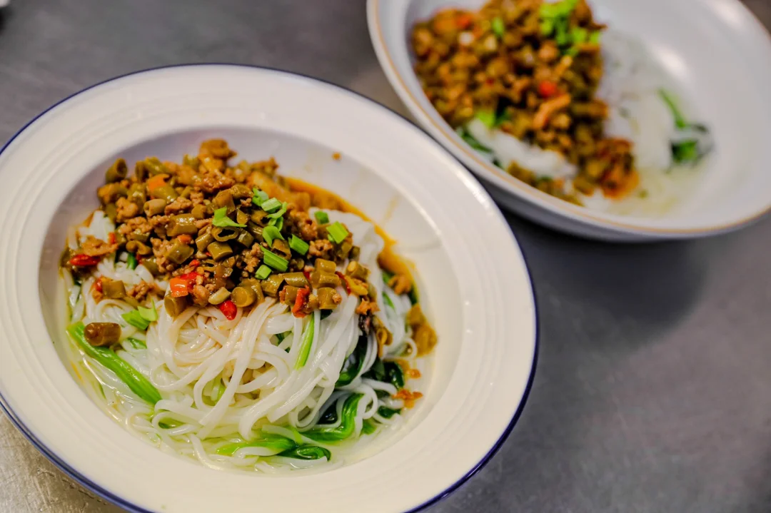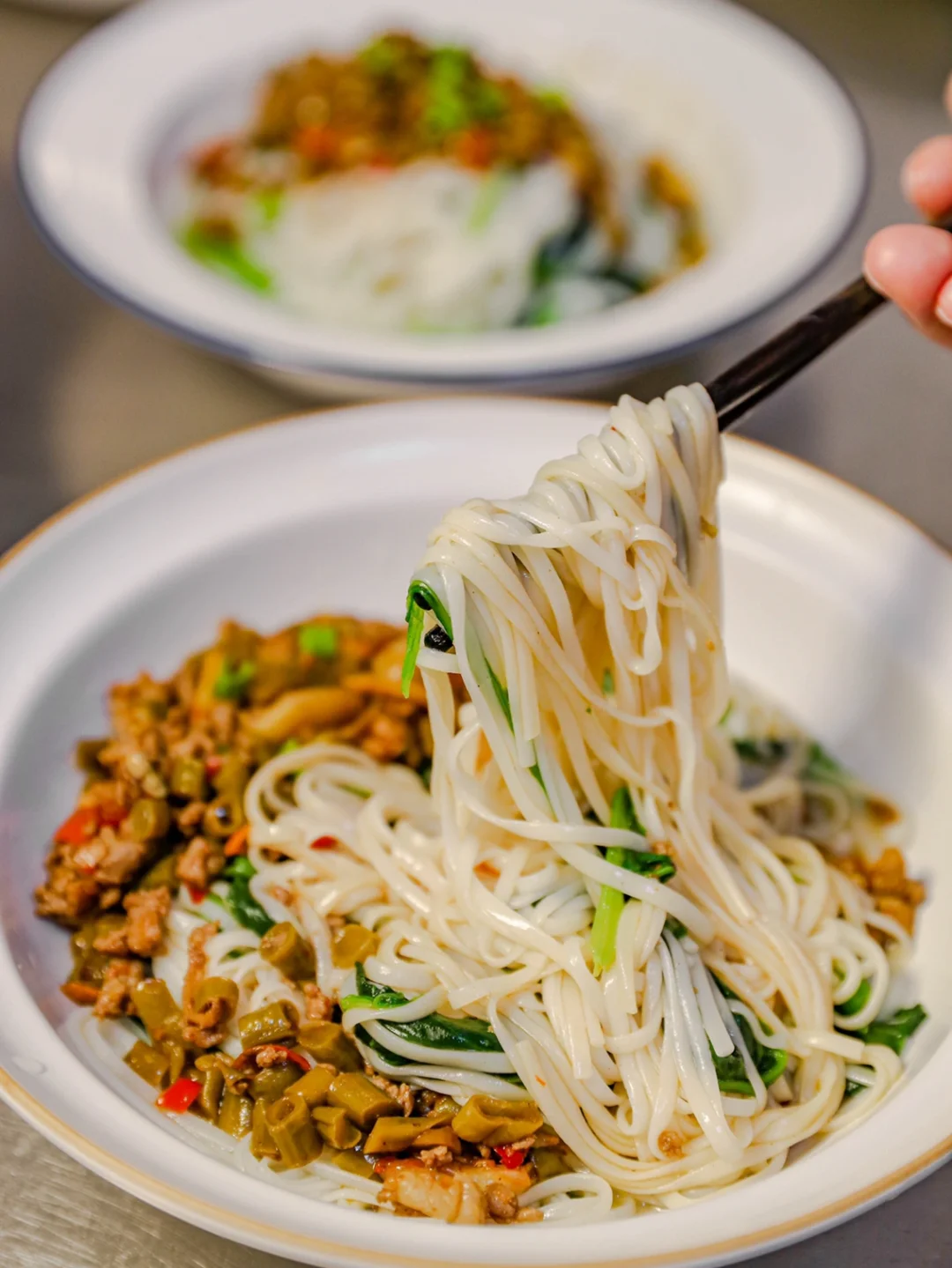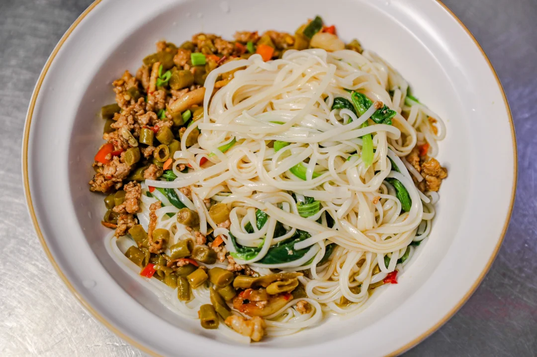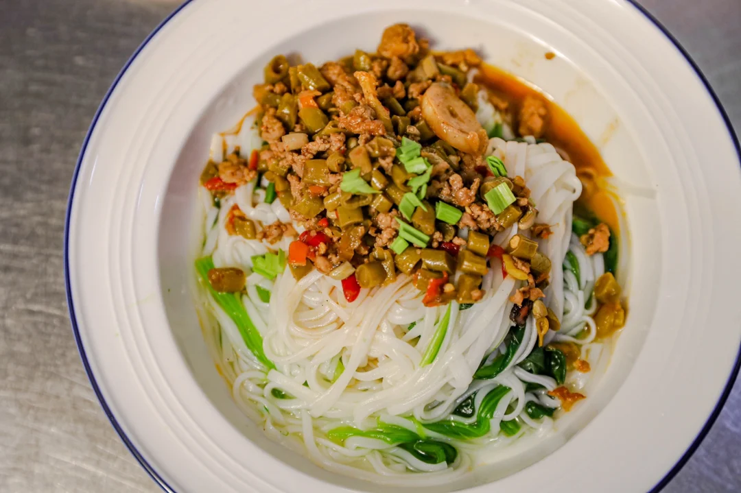 ✨4.面条里也可以加一些蔬菜,铺上肉末酸豆角即可。