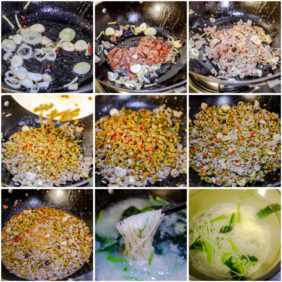 ✨3.锅烧热,加入食用油,放入2颗八角,葱姜蒜小火炒香,加入肉末,加入黄酒,炒变色之后加入酸豆角,让肉的味道和酸豆角味道充分融合,平摊开来炒一会儿,加入一点清水,因为要拌面或者拌粉么,熟透了之后,加入芝麻油,翻炒均匀。