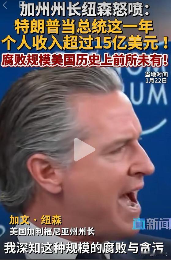 太不可思议了!加文纽森近日公布了一个令人震撼的数据,他说特朗普担任总统这一年,其个人收入竟然已经超过15亿美元,这种规模的贪污与腐败在整个美国历史上都绝无仅有。 其实这没啥好奇怪的,在美国政坛,明目张胆的收钱办事早已过时,真正的高手都在玩“合法合规”的套路,那些看似光鲜的政治人物,总能把权力转化为巨额财富,却让外界抓不到把柄,这比直白的贪腐更让人无奈。 最常见的就是“权力旋转门”,不少官员在位时不直接牟利,却会给利益集团行方便,等一离任就立马“下海”。 他们要么去企业拿高薪任职,要么开咨询公司,靠当年积累的人脉和内部消息牵线搭桥,本质就是对在位时“人情”的延期兑付。 更讽刺的是,半数离任国会议员都会投身游说行业,把公权力人脉变成私人摇钱树。 美国的法律漏洞更是给腐败开了绿灯,所谓的反腐法案要么处罚极轻,要么界定模糊。 这种系统性腐败,早已扎根美国政治根基,表面上有一套监管体系,实则处处为资本让路,最终形成“富人掌权、掌权谋富”的循环,普通民众只能沦为这场游戏的旁观者。 而特朗普,也只不过是这套“资本腐败”的游戏里玩得较好的玩家之一罢了。 以上均是小编个人看法,如果您也认同,麻烦点赞支持!有更好的见解也欢迎在评论区留言,方便大家一同探讨。{抱拳}