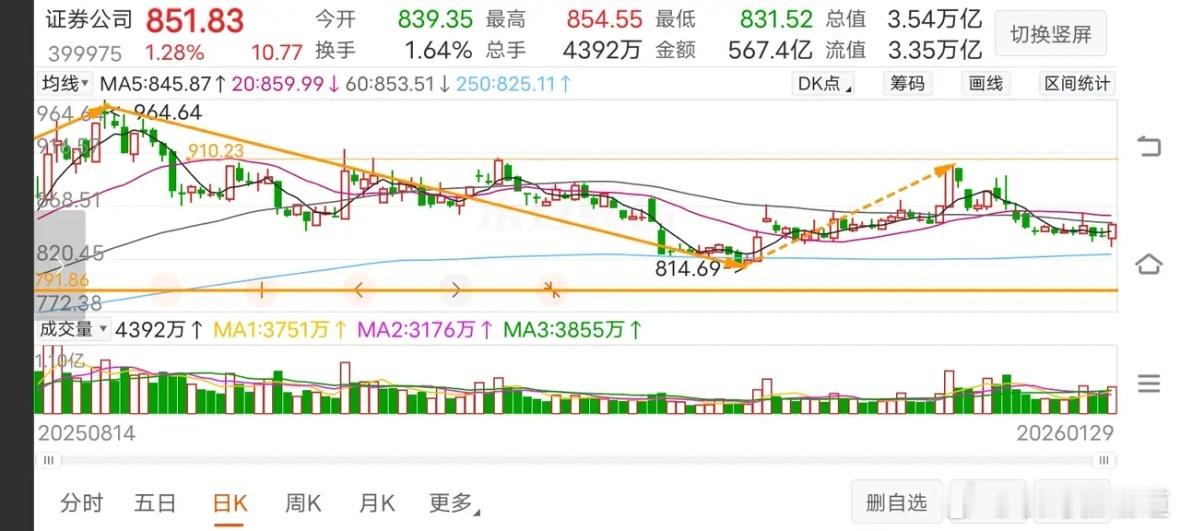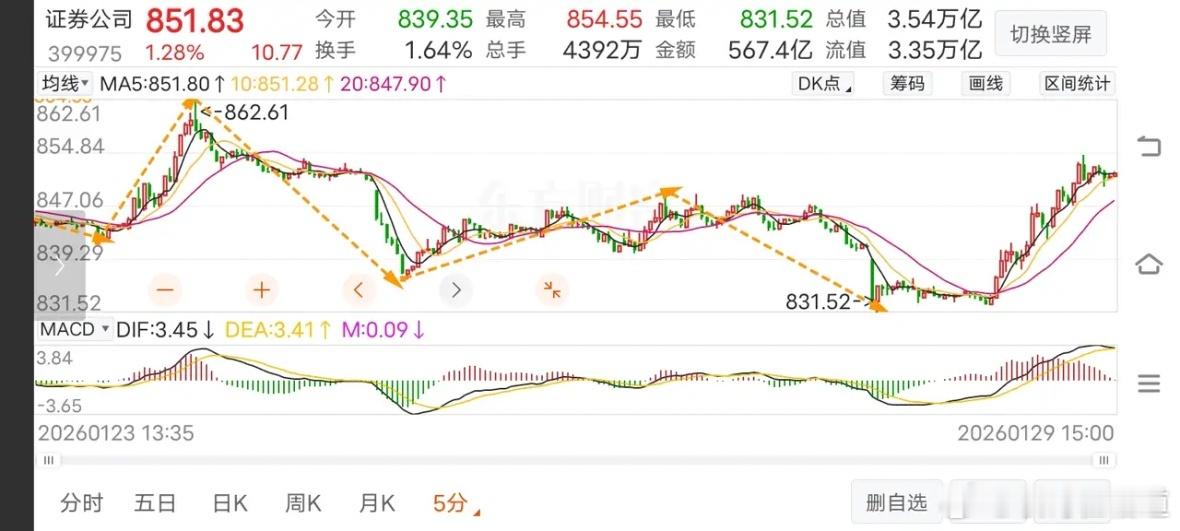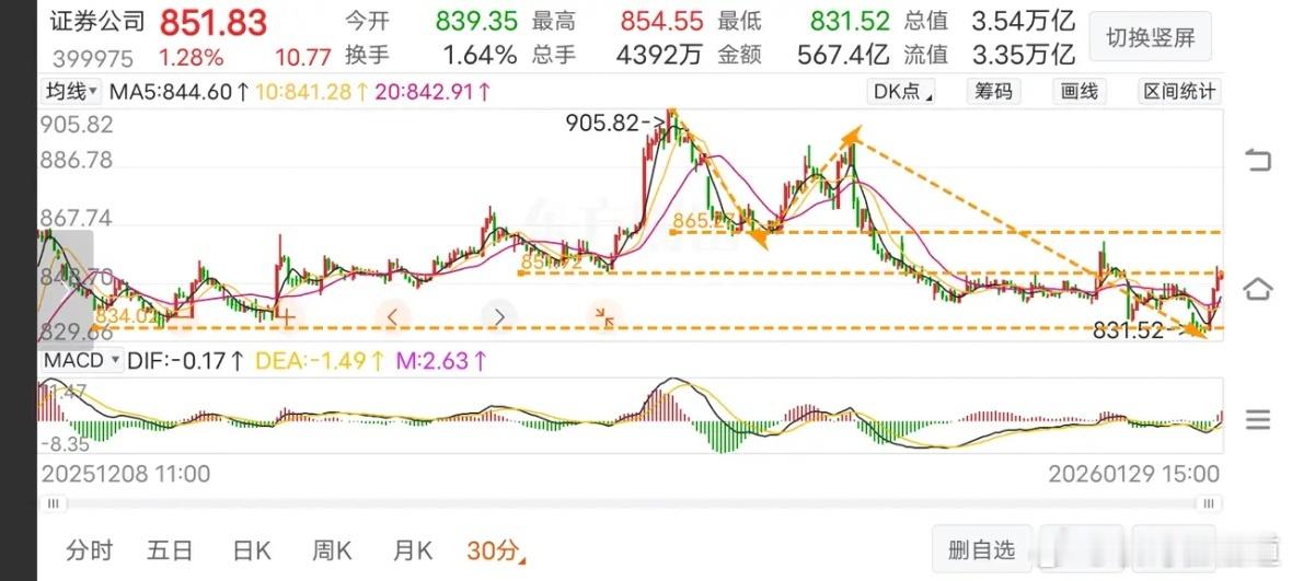 1月29日《证券》收评证券今天上涨1.28%,资金流入10.9亿,49支个股46支收红,1支收平,2支收绿,其中华林证券领涨。今天的走势令人意象不到,上午盘中不创下新低,下午开盘马上拉升,一直持续到下午二点半后才有所回落,明天能不能持续上涨?下面进入K线图进行分析。日线。今天继续探底,下午持续拉升,最终放量收了根带下影线小阳k。今天高点未有效突破季线的压力,明天如果还能上涨,将面临20均压力,如果能带量突破,就算是收出底分型了,反之还有继续试探年线的可能性。30分走势。30分走势有反弹是必然的,C浪内部存在明显的背驰,问题的关继是4浪能反弹多高?反弹出3卖还是类2卖?暂时不需要考虑,目前重点关注4浪反弹,而4浪反弹大概明天会给予确认。5分走势。从5分走势看,下午的反弹力度还算不错,算是对此前走势作了反转信号,明天今不会先继续上涨,暂不去论。重点是捕捉回调的5分2买,可以842为支撑。如果2买能构建确认30分4浪反弹,要求必须上破866。股市有风险,投资需谨慎。以上仅供参考,据此投资风险自负。