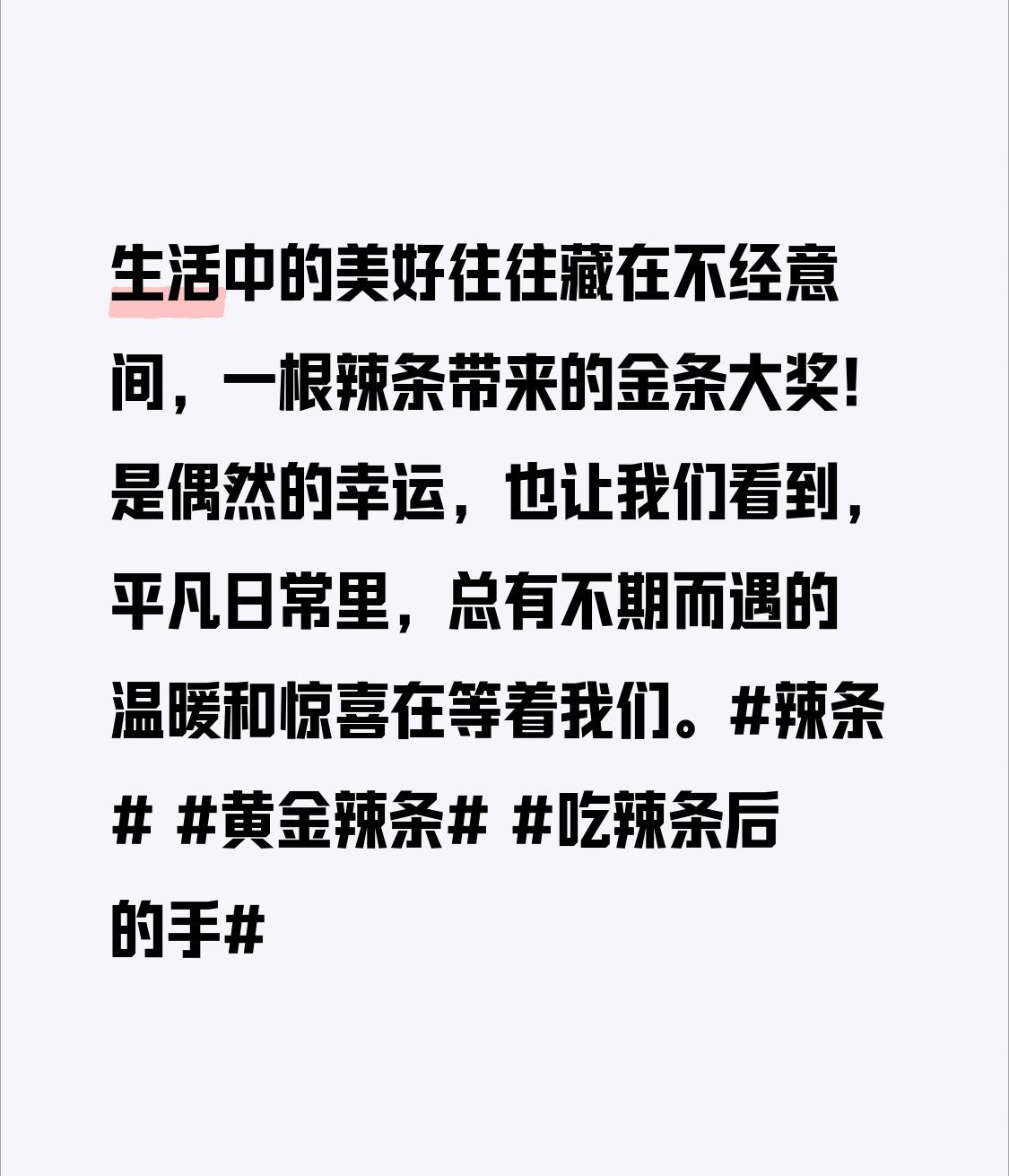 幸运爆棚!女生吃辣条吃出金条大奖 平凡的日常总藏着不期而遇的惊喜,近日一位女生吃辣条时,意外吃出金条大奖的消息,让不少网友直呼“羡慕到原地跺脚”,这份突如其来的幸运也成为了网友们热议的欢乐话题。 据了解,这位女生是辣条的忠实爱好者,闲暇时总爱囤上几包解馋。当天她拆开一包常吃的辣条,边吃边翻找包装袋里的小零食,指尖却触到了一个硬邦邦、不同于辣条的金属物件。 起初她以为是食品里的异物,仔细一看才发现,竟是一枚刻着字样的小金条,配套的卡片上清晰写着“金条大奖”,这让她瞬间愣在原地,反复确认后才敢相信自己中了奖。 惊喜之余,女生第一时间拍下视频分享了这份幸运,画面里,金灿灿的金条与红彤彤的辣条包装袋形成鲜明对比,幸福感溢于言表。 她坦言,自己吃了多年这款辣条,从未想过会成为幸运儿,开奖的瞬间心跳都漏了一拍,“本来只是解个馋,没想到吃出了‘黄金惊喜’,这波血赚!” 视频一经发布,立刻引发了网友的热烈讨论,评论区瞬间被羡慕的声音刷屏。有人调侃“原来吃辣条真的能发家致富,我这就去囤货”,也有人打趣“我吃了半辈子辣条。 只吃出过小卡片,差距怎么这么大”,还有网友好奇追问辣条的品牌,直言要去试试手气,相关话题也凭借满满的欢乐感,迅速登上了社交平台的热门榜单。 其实这类食品抽奖活动并不少见,金条、现金、数码产品都是常见的大奖,既为品牌增加了趣味,也让消费者在购物时多了一份期待。 这位女生的幸运经历,不仅让大家感受到了小美好,也为平淡的生活添了一抹亮色!不少网友表示,看完这个消息,瞬间有了吃辣条的动力,毕竟谁也不知道,下一个拆出惊喜的人,会不会就是自己。 生活中的美好往往藏在不经意间,一根辣条带来的金条大奖!是偶然的幸运,也让我们看到,平凡日常里,总有不期而遇的温暖和惊喜在等着我们。辣条 黄金辣条