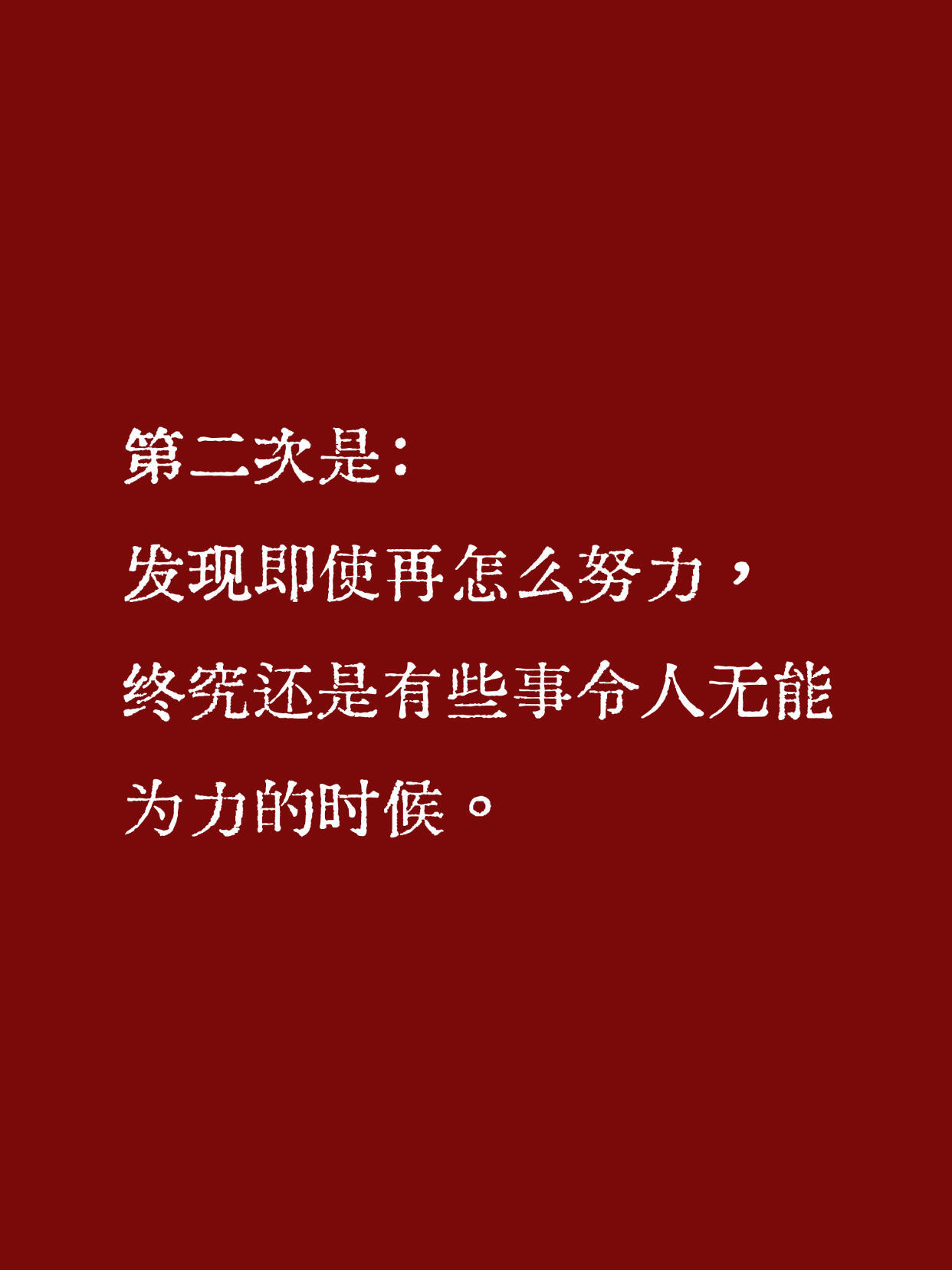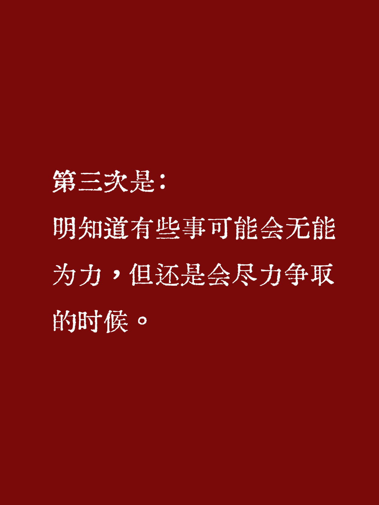 书上说,人要长大三次:第一次是:发现自己不是世界中心的时候。第二次是:发现即使再怎么努力,终究还是有些事令人无能为力的时候。第三次是:明知道有些事可能会无能为力,但还是会尽力争取的时候。