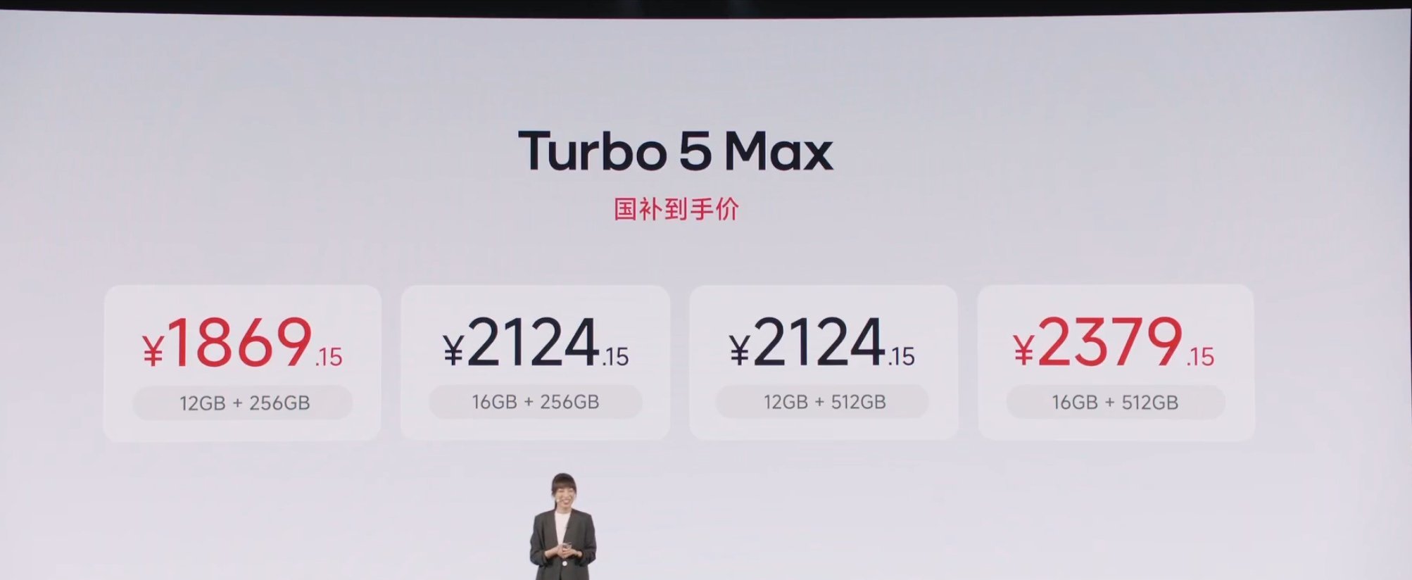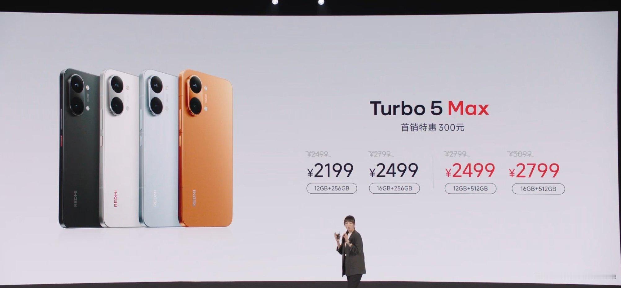 REDMI Turbo 5 Max 发布,12+256GB 售价: 2199 元(国补后 1869.15 )、16+256GB 售价: 2124.15 元、12+512GB 售价: 2499 元(国补后 2124.15 )16+512GB 售价: 2799 元(国补后 2379.15 ),- 芯片:首发 9500s 移动处理平台,LPDDR5X Ultra 内存,UFS 4.1 闪存,5800mm² 3D LHP 冰封散热系统,小米 T1S 信号增强芯片,狂暴引擎;- 屏幕:6.83 英寸 2772×1280 柔性 OLED 直屏,M10 发光材料,手动最高亮度 800nit、全屏激发 2000nit、25% APL 局部激发 3500nit,支持 120Hz 刷新率,480Hz 触控采样率(2560Hz 瞬时触控采样),3840Hz 高频 PWM 调光+类 DC 调光,12bit 色深,支持 HDR 10+、湿手触控;- 相机:前置 20MP(豪威 OV20B,1/4"),后置 50MP 主摄(首发光影猎人 600,即思特威 SC532HS,1/2",12.5EV 动态范围,OIS)+8MP 超广角(思特威 SC821CS,1/4");- 续航:9000mAh 金沙江电池(硅含量 16%,能量密度 894Wh/L),支持 100W 快充,30 分钟充电 50%,27W 反向有线充电,支持旁路充电,搭载小米澎湃 G1 电池管理芯片,电池增压芯片,小米澎湃 P3 快充芯片;- 其他:厚 8.15mm,重 219g,暗影黑、祥云白、海风蓝、阳光橙 4 款配色,金属中框,玻纤后盖,0809 X 轴线性马达,双 1115F 扬声器,支持 NFC、红外遥控,IP66 & IP68 & IP69 & IP69K 防尘防水,Wi-Fi 7,蓝牙 5.4,四频北斗+双频 GPS,超声波屏幕指纹,搭载澎湃 OS 3 系统。红米Turbo5发布会Turbo5Max