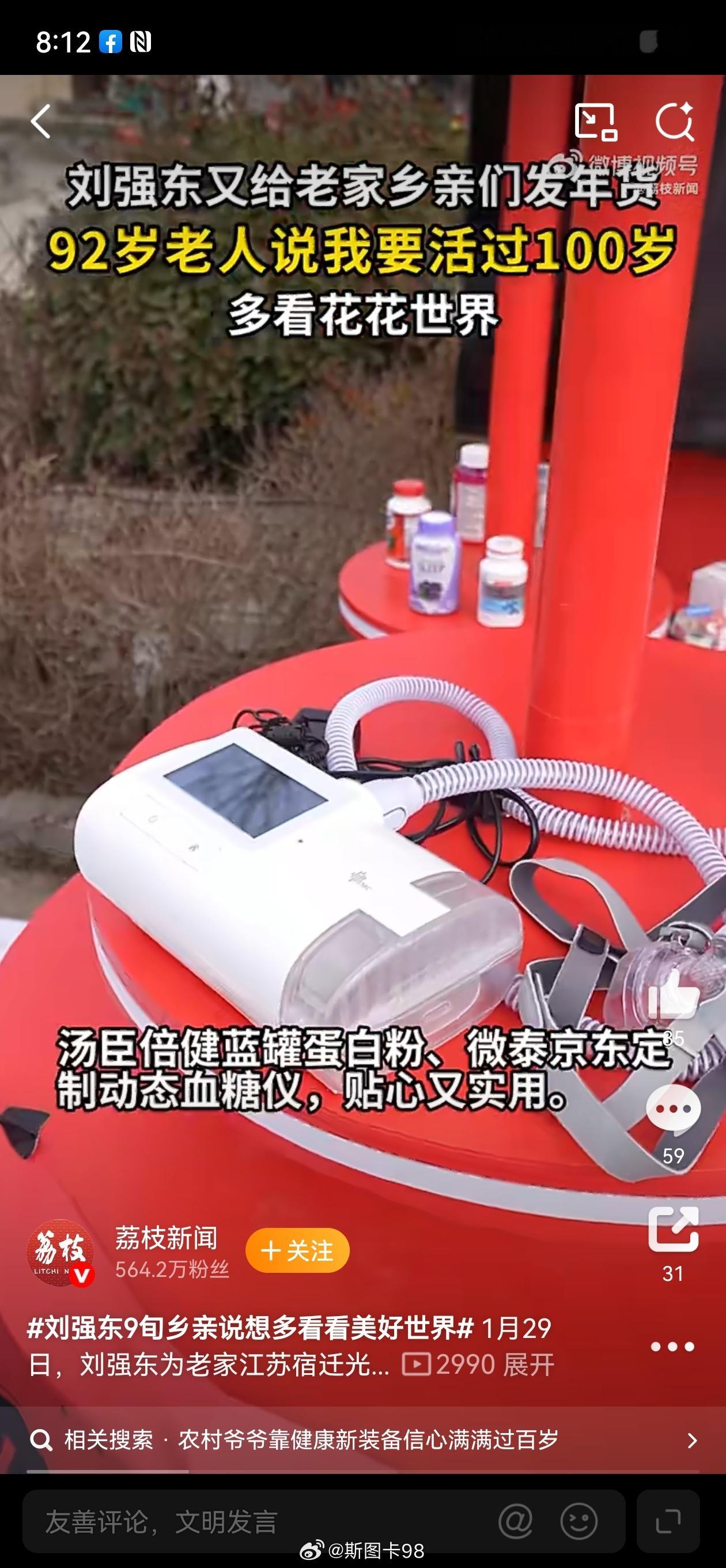 刘强东9旬乡亲说想多看看美好世界刘强东为老家宿迁光明村送年货,一位九旬乡亲直言想多看看这美好世界,朴实话语满是动容。这份心愿也成了刘强东的牵挂,今年的年货不仅有米面油、健康器械,更有能识别方言的适老AI手机,让老人轻松用科技看世界、享生活。他还为村里建AI教室,十二年反哺家乡,从物资馈赠到科技赋能,把乡亲的心愿化作实实在在的陪伴与守护。农村爷爷靠健康新装备信心满满过百岁