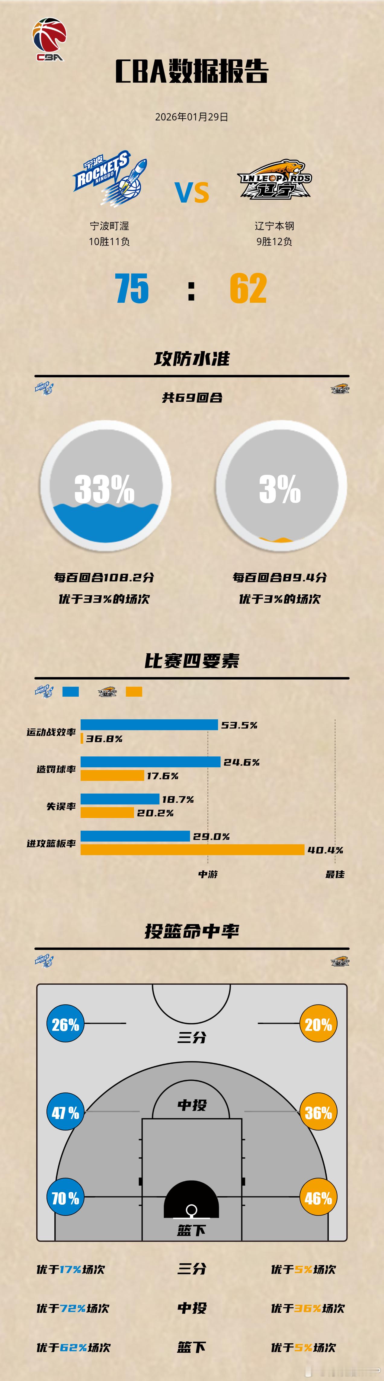 宁波男篮队史首次战胜辽宁男篮。辽篮进攻火力匮乏,全场62分,赛季第二低,半场仅得29分,第二节和第四节分别只得12分。全队12人出战只有2人得分上双,王岚嵚砍下全队最高的19分,威尔斯10分,赵继伟8分,三外援合计得到23分。而宁波男篮赢球恰恰赢在三位外援的得分能力上,宁波全队只有三位外援得分上双,他们合砍49分,比辽篮外援得分多了一倍不止。还是那句话,外援成色决定球队成绩,而投资力度决定外援成色,辽篮如何调整,取决于投资人对球队的定位。宁波男篮战胜辽宁男篮