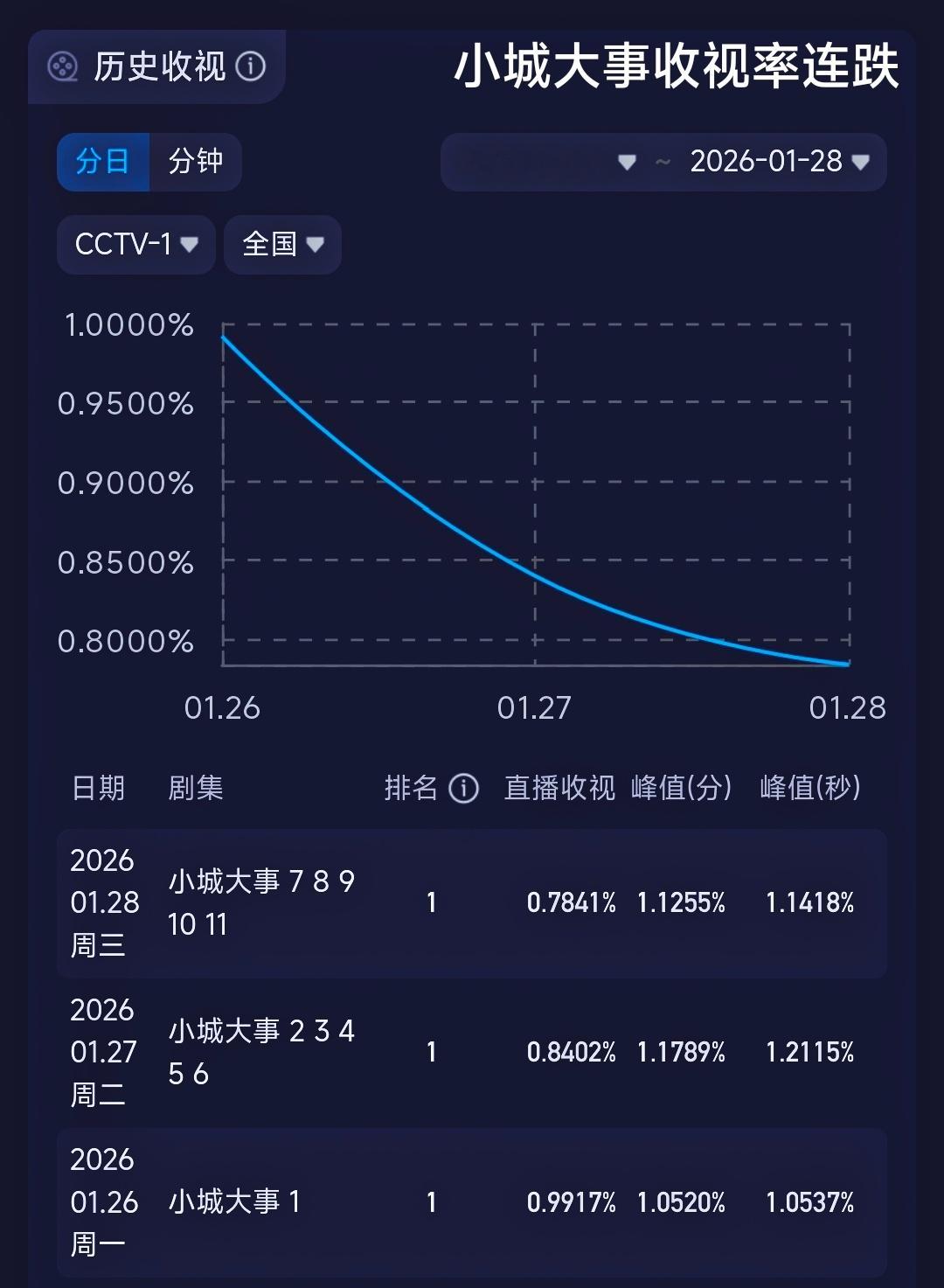 噗噗噗到看不到底?《小城大事》这是不论在哪播都收视连跌啊?最近在央视下午档,也是三连跌。在央八也是跌破近半年收视底盘,在网播也是一直低位横盘。。。