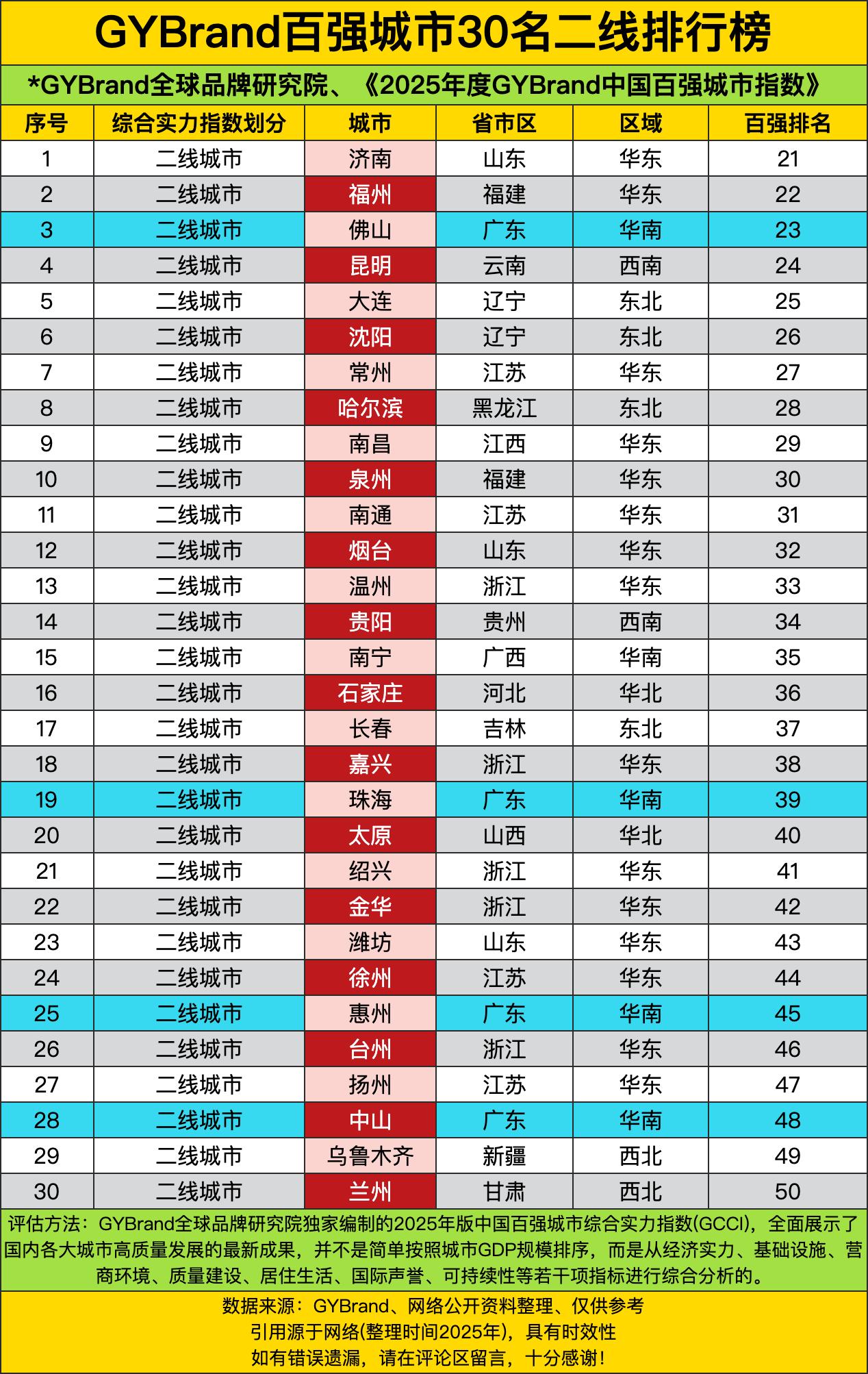 这榜单就跟城市界的“琅琊榜”似的,把二线城市们整得明明白白。济南稳坐头把交椅,以21名的成绩领跑二线阵营。咱就说,济南这是铆足了劲往前冲啊,泉水叮咚的城市魅力,加上不断发展的综合实力,妥妥的二线“大哥”范儿。 再瞅瞅华东地区,那真是二线城市的“兵家必争之地”。福州、常州、温州等城市都在榜单上争奇斗艳。福州作为东南沿海的重要城市,带着独特的闽都文化,在这排行榜上占了一席之地。而常州呢,工业发展那是杠杠的,就像一个低调的实力派,在二线城市的舞台上默默发光发热。 华南地区的佛山和南宁也挺厉害。佛山,那可是制造业的圣地,什么家电、陶瓷,那是闻名遐迩。南宁呢,作为广西的首府,正努力在西南和华南之间找到自己的节奏,像个活力满满的小伙子,大步朝着更好的方向迈进。不过这竞争也激烈啊,后面的城市可都在虎视眈眈呢。 其他地区的城市也都各有千秋。昆明有着四季如春的气候和丰富的旅游资源,像个悠闲的“文艺青年”;大连和沈阳,东北的老牌城市,虽然面临着一些挑战,但底蕴还在,就像沉稳的中年人,随时准备东山再起。总之,这二线城市排行榜,看点多多,未来这些城市的竞争和发展,咱就拭目以待吧!