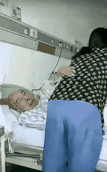 医院里的一幕 医院里的病床上,躺着一个白发苍苍的大爷,一个女子正在给大爷整理床
