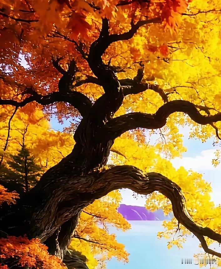 古老树干撑着天 枝上盖满碎金片 晴天染得秋意深 晚霞多彩若诗篇