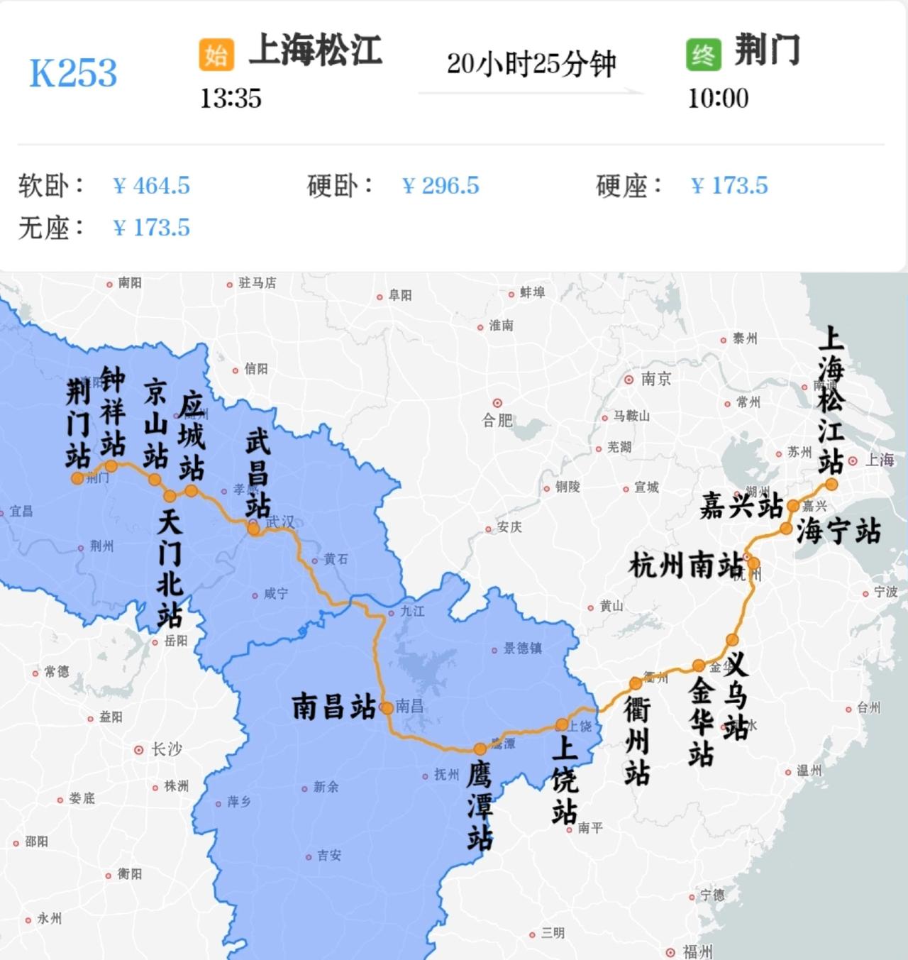 2026年1月30日–2月13日,2月19日–3月11日恢复开行荆门到上海松江K254/K251次,荆门站16点46分开,第二天12点30分到上海松江站,用时19小时44分钟。 2026年1月31日–2月14日,2月20日–3月12日恢复开行上海松江到荆门K253/K252次,上海松江站13点35分开,第二天10点到荆门站,用时20小时25分钟。