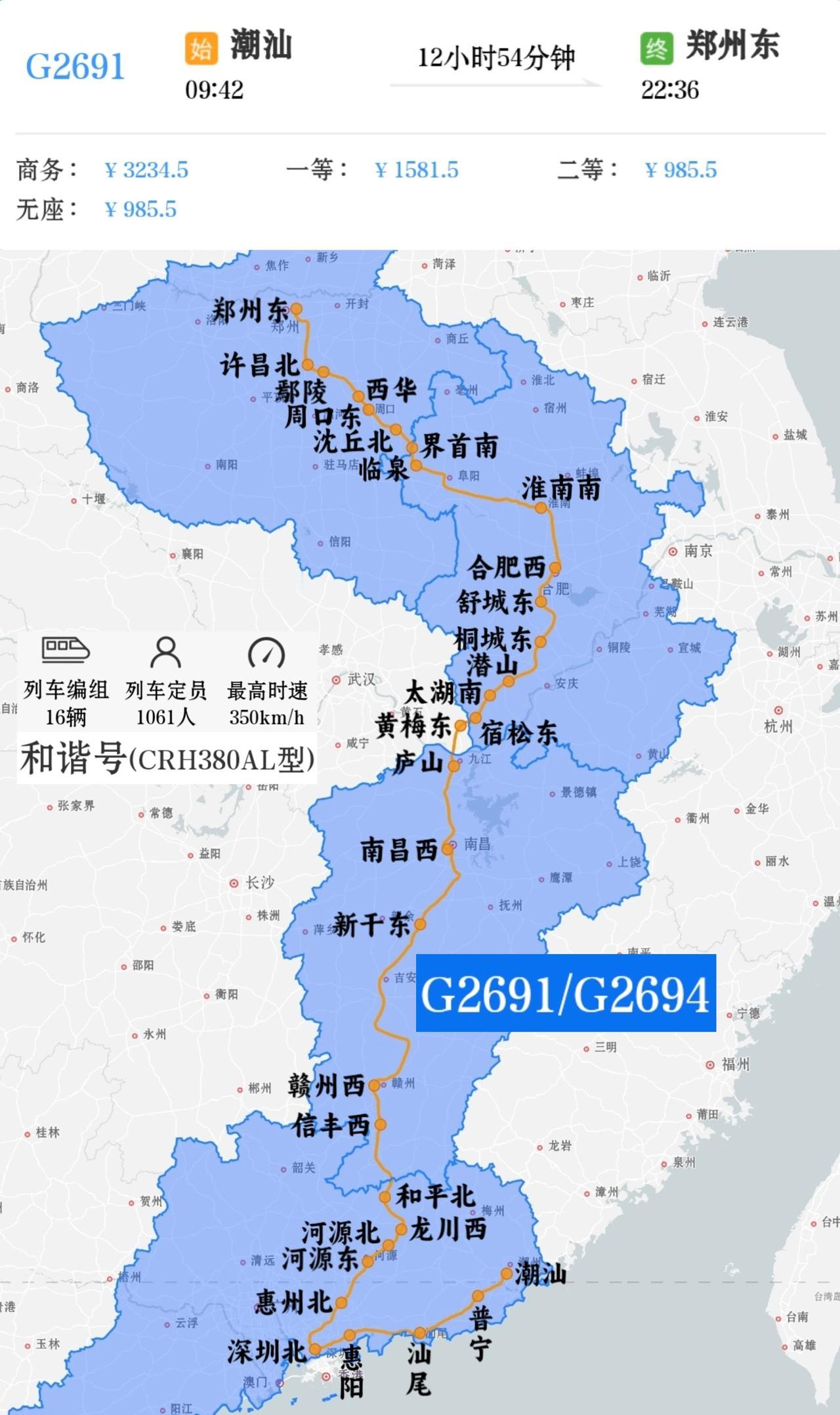 新乡东到潮汕G2693/G2692次 潮汕到郑州东G2691/G2694次