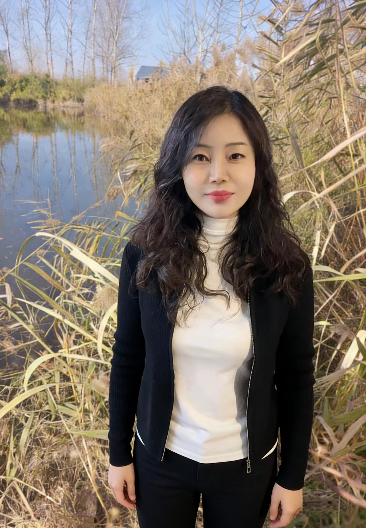 荒郊草色带秋霜,素服佳人立野塘。 风动发丝如浪起,半轮晴日透衣香。