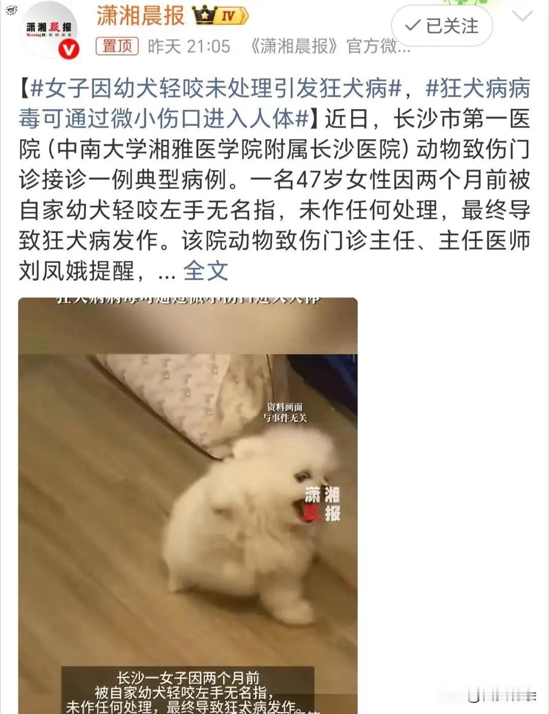 近日,长沙市第一医院动物致伤门诊接诊一例典型病例。一名47岁女性因两个月前被自家幼犬轻咬左手无名指,未作任何处理,最终导致狂犬病发作。该院动物致伤门诊主任、主任医师刘凤娥提醒,任何动物咬伤、抓伤,无论伤口大小,均不可轻视。 有网友表示:我被同事家狗咬了手指。流了很多血。当时就去打疫苗了。但当时打疫苗的医生说打了疫苗也不一定完全不得狂犬病。回来自己在家在手机上看狂犬病症状越看觉得自己越对症。然后就得了严重的焦虑症。 我喜欢养狗,养了二十多年的狗,有法斗、狮子狗和川西猎犬都养过。被狗误伤是常有的事,一般就用清水冲冲或者用酒精擦一下都没有问题。如果真有自家狗传染狂犬病毒那只是个概率问题。这种事情少之又少,我没有看见过。 如果狂犬疫苗坚持求真务实的话!即使是疯狗咬了,打了狂犬疫苗是有效的!大概四十多年前我哥在放学的路上被真正的疯狗咬伤手,两只手血肉模糊!结果我二哥骑自行车三十多里路带我三哥到防保站打了一针疫苗结果好了!彼时打疫苗是不要钱的! 不论被大狗还是小狗咬了,必须打狂犬疫苗,但是如果咬人的狗10天内没有发作或死亡,就基本可以判断这条咬人的狗没有携带狂犬病毒。 对此大家怎么看呢