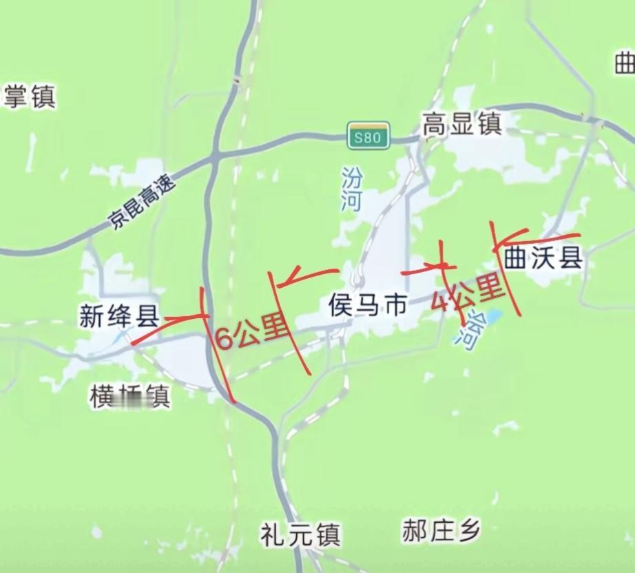 如图所示,新绛县与侯马市建成区之间只相隔6公里;侯马市与曲沃县建成区之间只相隔4公里。在全中国2800 多个县级行政区划中绝无仅有!侯马 新绛县