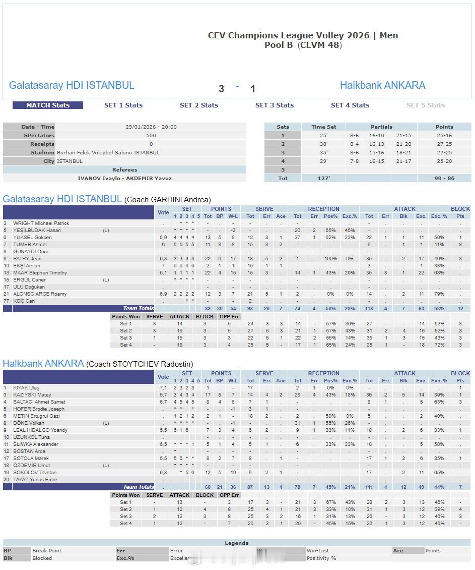 【欧冠男排土耳其德比战:加拉塔萨雷3-1浩克银行】国际排坛战报速递 1月29日,欧冠男排第四轮第四回合,B组土耳其德比战,加拉塔萨雷主场3-1(25-16/27-25/22-25/25-20)战胜安卡拉浩克银行。MVP帕特里和马尔各22分、尤克塞尔13分、阿隆索12分、图莫尔11分,卡兹伊斯基17分、索科洛夫12分。