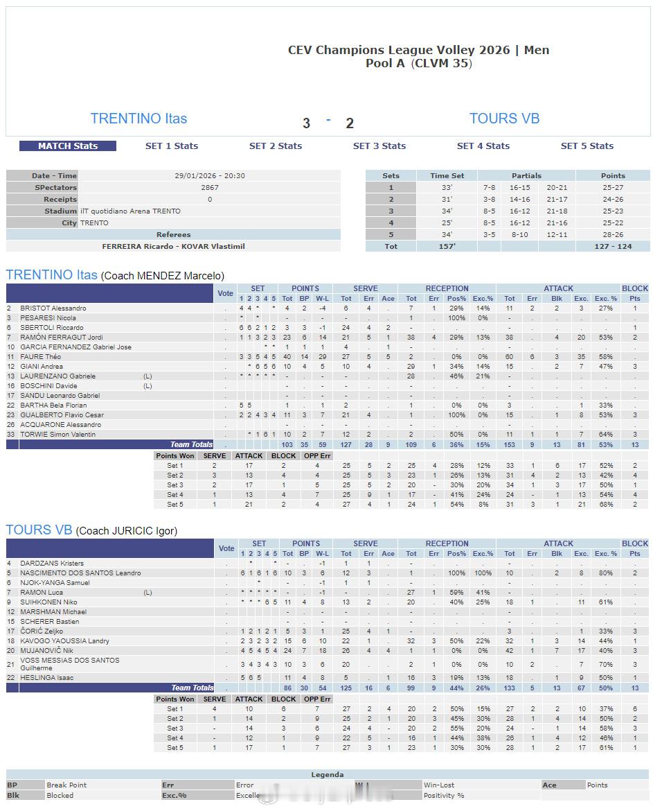 【欧冠男排特伦蒂诺157分钟3-2艰难逆转图尔 弗雷40分】国际排坛战报速递 1月29日,欧冠男排第四轮第四回合,A组意大利特伦蒂诺主场苦战2小时37分钟,在以接近比分连失两局的情况下连扳三局、决胜局战至28-26,才以3-2(25-27/24-26/25-23/25-22/28-26)艰难逆转法国图尔。MVP弗雷40分(60扣35中5发)、拉蒙23分、弗拉维奥11分、吉亚尼和托维各10分,穆亚诺维奇24分、卡沃戈15分、苏伊科宁和海斯林加各11分、N-多斯桑托斯和V-多斯桑托斯各10分。