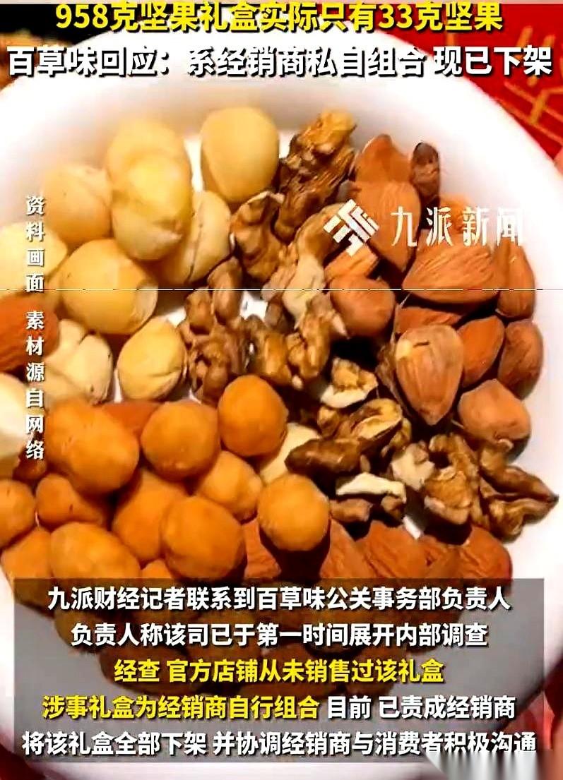我真的会谢。 958克的“坚果大礼盒”,最后称出来,正儿八经的坚果,就33克。 连一两都不到。 剩下的900多克是啥?是我的冤种气质,还是我的新年祝福? 这事儿一出,品牌方赶紧出来说话了。 哎呀,这个不是我们官方店卖的啦,是经销商自己“DIY”的。 这话说的,多轻巧。 你的牌子,你的授权,出事了就说孩子是别人家的? 消费者哪分得清哪个是亲儿子哪个是干儿子,我们认的是你这张脸啊。 最逗的是,他们还说,经销商在详情页里把每样东西的克重都标清楚了。 拜托,谁买个年货礼盒,还跟做数学题似的,拿着计算器一项一项加啊? 我看到的是“坚果大礼盒”这五个大字,是对你这个品牌的信任。 结果你跟我玩“大家来找茬”? 说白了,这事儿的根子,不是那少了的几百克坚果,也不是那个经销商。 是品牌方自己对渠道的失控,对品牌声誉的漠视。 你把刀递给了别人,就别怪别人乱捅。 现在礼盒是下架了。 但被这33克坚果硌得生疼的心,可没那么容易抚平。