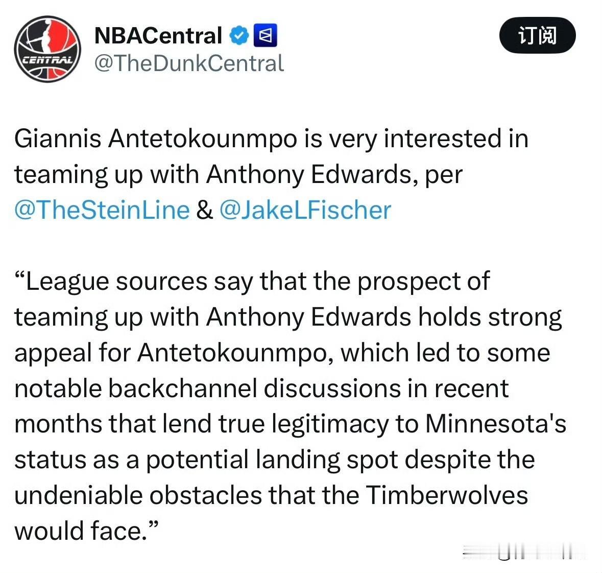 字母哥有意联手爱德华兹!!! 根据记者Stein和Fischer联合透露消息,雄鹿超级球星字母哥对于能够和森林狼球星爱德华兹合作非常感兴趣,他认为他俩联手的话前景非常乐观。 华子非常渴望冠军,而且他是想凭借自己的实力去争取,但是森林狼想要得到字母哥是非常不现实的,但是这两名球员在一起打球,画面简直不要太美。 虽然这过程是很艰难的,甚至是阻碍重重,但是为了华子和球队,森林狼愿意拼一次,所以尽管字母哥的下家不多,但是这些有过私下沟通的也都是一种可能,森林狼成为字母哥下家是具备可信度的。 希腊神兽和联盟未来的门面组合是非常令人期待的内外线组合,两个人的冲击力十足,这样的场景会让其他29支球队闻风丧胆的。字母哥 爱德华兹 爱德华兹森林狼 狼王爱德华兹
