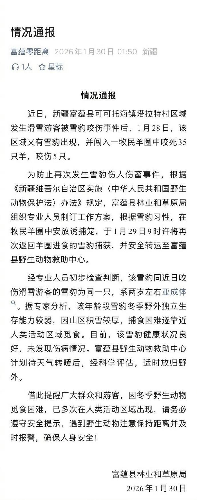 咬伤游客雪豹又咬死35只羊新疆通报咬伤游客雪豹再次出现 雪豹接连伤人和伤害家畜的根本原因是冬季野外觅食困难,转而到人类生活区域觅食。除了游客要保护好自己,不要到禁止区域下车或者拍照,相关部门也要采取措施,防止雪豹到居民区造成伤害。牧民家的羊在自己家里,可没到雪豹领地!