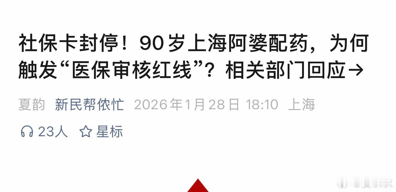 囤药上海一位90岁老人的社保卡,被封停了部分功能,原因是“囤药”。这件事情,很值得讨论一下。根据“新民帮侬忙”,市民万女士为90岁行动不便的母亲,代配降脂药后,母亲竟收到了《门急诊就医和药店配药异常情形审核通知书》,社保卡也被暂停了门急诊和药店的联网结算功能。原来,万女士为防止老人断药,养成了“囤药”的习惯。在2025年7月至10月这4个月内,她在华山医院、第十人民医院、同济医院等多家医院,为母亲配取了大量该药物。然而,这一行为触发了“警戒线”。根据去年8月15日实施的最新《管理办法》,万女士母亲的情况,符合两项异常标准:第一,超量配药。医嘱每日1片,4个月的合理用药量约为4盒,但实际配了13盒,超量达9个月。第二,就医次数超标。2025年10月,其门诊就医次数累计达18次,超过了“月门诊就医次数累计15次及以上”的异常标准。随后,万女士又没能在规定期间内,在线下窗口完成审核(未携带病历资料)。就这样,老人社保卡被“暂停联网结算”(住院和门诊大病不受影响)。而最终的处理结果是,万女士退还医保基金535.68元。此款项为“退款”而非“罚款”,是医保基金为超量药品所支付的费用。万女士退款后,其母亲的社保卡随即恢复联网结算。这件事情,我觉得有几点值得强调。首先,管理是需要的,毕竟医保资金是大家的,要断掉黄牛的倒卖途径。其次,我觉得政策没什么问题。其一,给了万女士半个多月时间,通知到线下办理审核。因为万女士自身因素,未完成审核,才开始暂停功能。其二,停的是联网结算,住院和门诊大病不受影响。其三,万女士付的,只是退款,而非罚款。再次,我也理解万女士,相信她不是黄牛。老人想要多备一点药,这种心情完全可以理解。打击黄牛的这个政策,要让老百姓充分知晓。最后,我想说的是,通过这件事,能不能进一步通过大数据,来更好地服务老百姓。各医院开药的情况,要互通,要在“开药警戒线”,前发出提醒。当然,更要从根本上意识到,99.99%的老人,只想“手中有药,心中不慌”,而不是为了骗保。本地新闻上海看病多开药是囤药吗晏秋秋