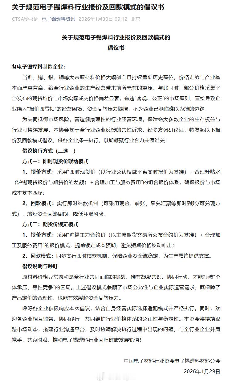 中国电子材料行业协会电子锡焊料材料分会:关于规范电子锡焊料行业报价及回款模式的倡议书各电子锡焊料制造企业:当前,锡、银、铜等大宗原材料价格大幅飙升且持续盘踞历史高位,价格走势与产业基本面严重背离,给全行业企业的生产经营带来前所未有的重压。与此同时,部分价格采集平台发布的现货均价与市场实际成交价格偏差显著,有违“客观、公正”的市场原则,直接导致企业陷入“报价即亏损”的经营困境,资金周转压力陡增,不少企业已濒临难以为继的边缘。为共同抵御市场风险,营造健康理性的行业经营环境,保障绝大多数企业的生存权益与行业可持续发展,本协会基于全行业企业反馈的共性诉求,经多方调研论证,特发起以下报价及回款模式倡议,供各企业择一执行,以期凝聚行业合力共渡难关!倡议执行方式(二选一)方式一:即时现货价联动模式1、报价方式:采用“即时现货价(以行业公认权威平台实时报价为基准)+合理升贴水(沪锡现货报价与期货价的差额)+合理加工与服务费用”的组合报价体系,确保报价与市场成本基本匹配;2、回款模式:实行即时结款机制(可采用现金、转账、承兑汇票等即时到账/可兑现方式),缩短资金回笼周期,降低坏账风险。方式二:期货价锁定模式1、报价方式:采用“沪锡主力合约价(以主流期货交易所公布合约价为基准)+ 合理加工及服务费用”的报价模式,提前锁定成本预期,避免短期价格波动冲击;2、回款模式:同步实行即时结款机制,保障企业资金流稳定,为生产履约提供支撑。倡议说明与呼吁原材料价格异常波动是全行业共同面临的挑战,唯有凝聚共识、协同行动,才能打破“个体承压、恶性竞争”的困局。上述倡议模式兼顾了市场公允性与企业实际运营需求,既保障了产品定价的合理性,也能有效缓解资金周转压力。呼吁各企业积极响应本次倡议,结合自身经营实际选择适配模式并严格执行。同时,欢迎各企业相互监督、协同践行,共同维护行业价格体系的公正性与稳定性。本协会将持续跟踪市场动态,搭建行业沟通平台,及时协调解决执行过程中出现的问题,与全行业企业并肩携手,共克时艰,推动电子锡焊料行业回归健康发展轨道!中国电子材料行业协会电子锡焊料材料分会2026年1月29日沪锡期货