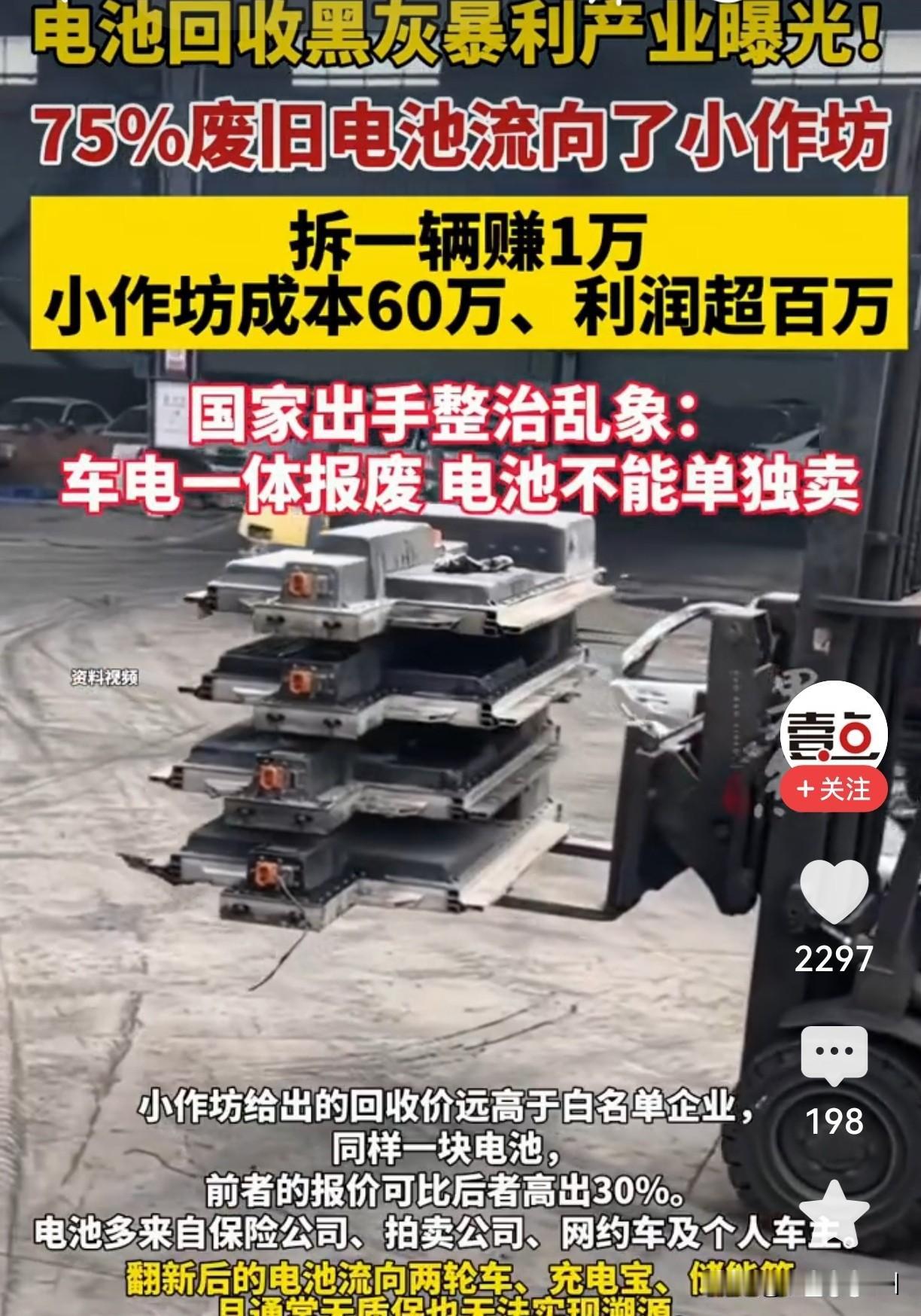 拆一辆新能源车净赚1万?电池回收黑灰产,正在偷偷暴富! 前两天刷到一个视频,把我惊到了:路边一个小作坊,几个人戴着普通手套,拿着生锈的工具,“哐哐”几下就把一辆报废新能源车的底盘拆开,拽出那块巨大的动力电池。就这?还没完!他们说,光这一块电池,转手一拆一卖,轻轻松松净赚1万块! 你没听错,不是整车,是单靠里面那块电池。 听起来是不是像天方夜谭?但这正是眼下新能源车爆发背后,一条鲜为人知却暴利惊人的“黑金”链条——动力电池回收黑灰产。正规军还在建渠道、搞技术,人家“游击队”已经靠着低成本、野蛮操作,闷声发大财了。 这钱,到底是怎么赚的? 黑作坊根本不在乎什么资质、环保。电池收来,防爆、放电这些安全流程全省了,直接暴力拆解。他们眼里只有电池里的“宝贝”:钴、锂、镍这些贵金属材料。正规回收处理成本高,要专业设备、要环保处置。而他们呢?拆解几乎零成本,拆出来的核心材料,直接卖给一些“不问来源”的下游小厂,价格比正规渠道低,但架不住成本更低、来钱快啊!一辆车赚1万,十辆就是十万,简直就是“躺赚”。 暴利的背后,全是隐患和代价。 第一,毒害环境。电池里的电解液有毒,黑作坊往往直接倾倒,污染土壤地下水,后患无穷。第二,要命的安全风险。电池磕碰、短路极易起火爆炸,他们那操作环境,简直就是个不定时炸弹。第三,搞乱整个市场。正规企业收电池成本高、流程严,根本拼不过这些“价格屠夫”,结果就是“劣币驱逐良币”,行业更难健康发展。 新能源,本该是绿色的未来。可如果它生命的终点,是流入这样一条黑色产业链,被粗暴拆解、毒害环境、威胁安全,只为成全少数人的暴富梦,这难道不是一种讽刺吗? 我们支持新能源,是希望天更蓝,不是让某些人在灰色地带更“暴富”。 说到底,这不仅是个行业乱象,更是一面照妖镜。照出了监管的漏洞,照出了人性的贪婪——为了钱,可以无视环境、无视安全、无视未来。当暴利踩在绿色和安全的底线上,我们每个人,都可能成为最终的代价。 这事你怎么看?你觉得该怎样彻底管住这些“电池黑手”?你家有新能源车吗?会担心它未来的“归宿”吗? 评论区,一起聊聊! 动力电池回收黑幕 新能源车隐忧 暴利黑灰产