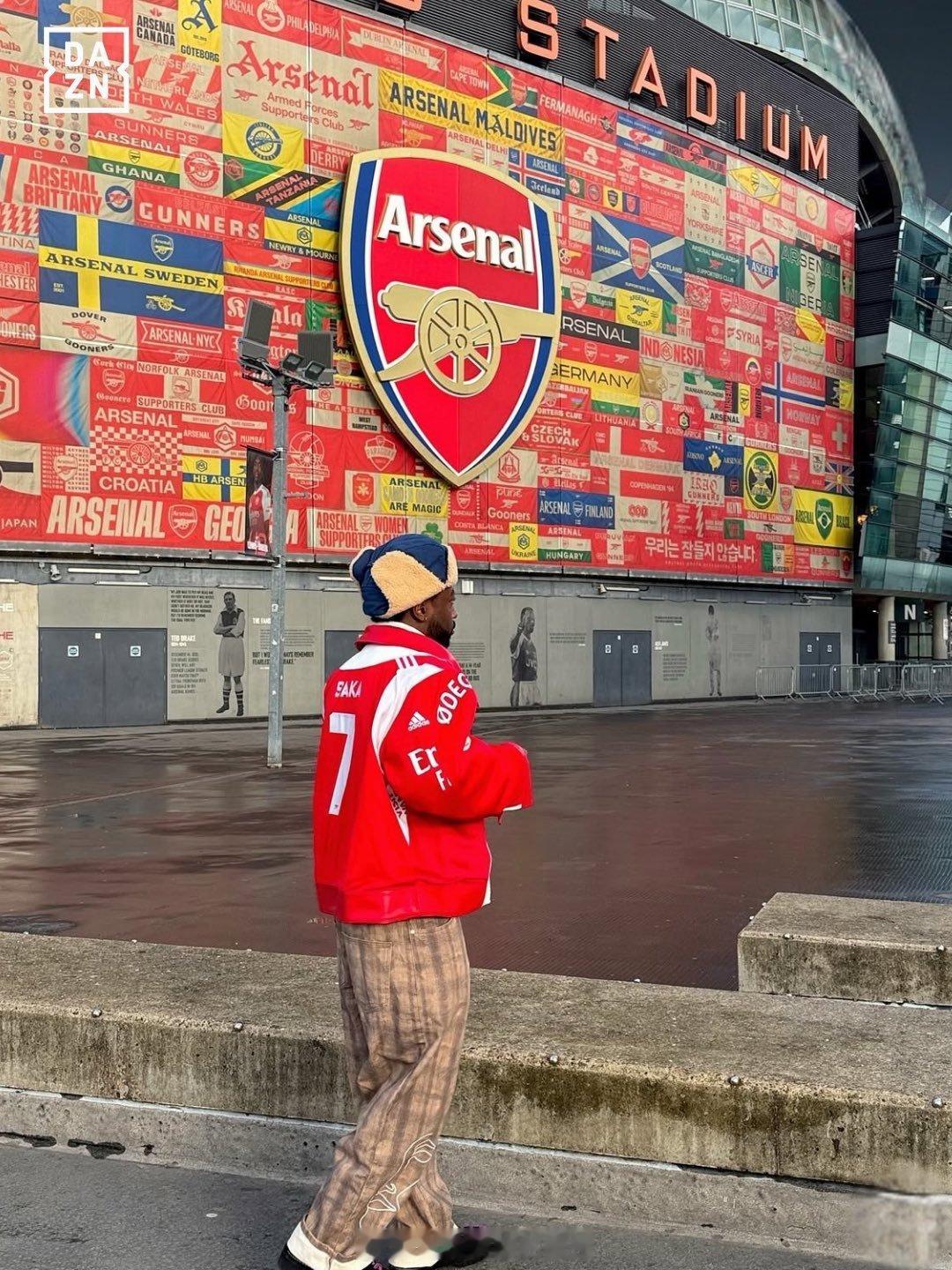 这位阿森纳球迷被拍到身穿一件超酷的皮夹克出现在酋长球场阿森纳著名教授