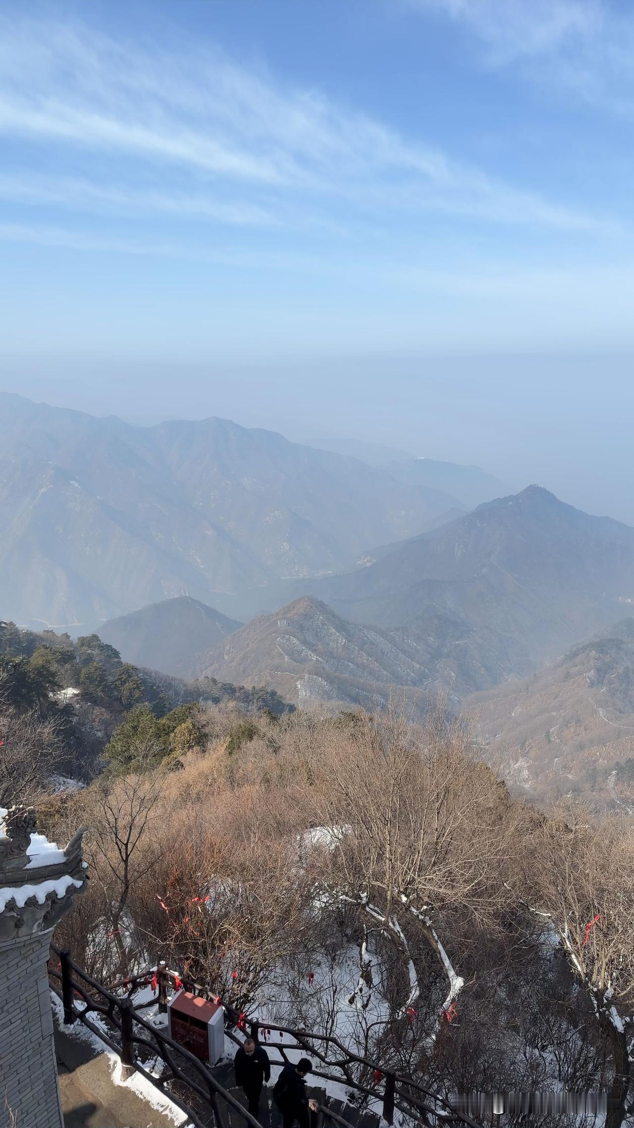 站在南五台山顶,风裹着清冽的寒气扑在脸上。脚下残雪未消,与枯黄的枝桠交织成冬末独有的模样。极目远眺,层峦叠嶂在薄雾里晕开深浅不一的黛色,像一幅晕染开的水墨画。 山路上的祈福红带在风中猎猎作响,游人的低语被风揉碎在山谷里。这一刻,城市的喧嚣被远远抛在身后,只剩下天地辽阔,和一颗被山风与暖阳熨帖得无比舒展的心。