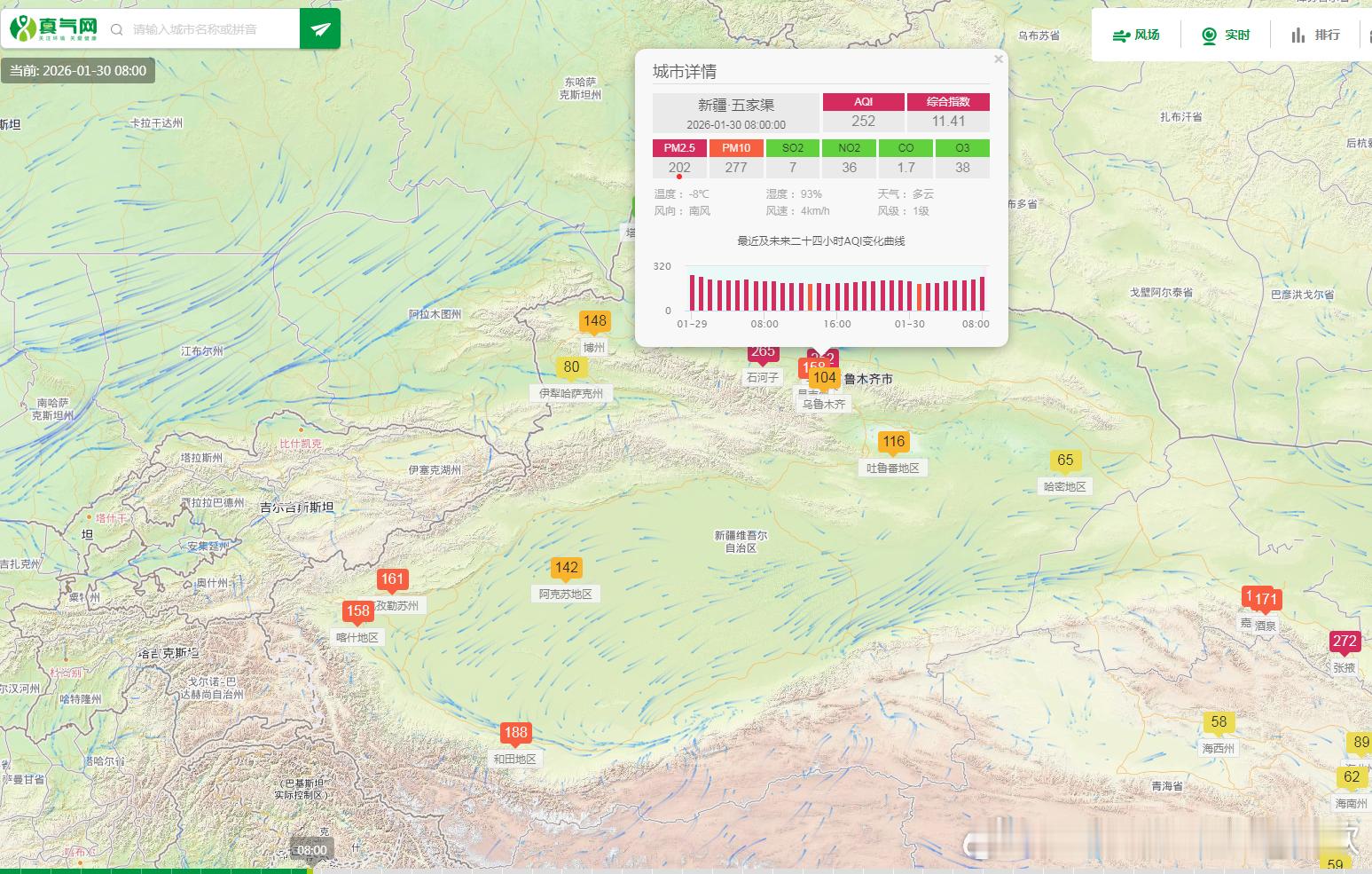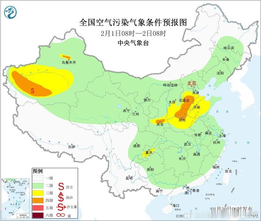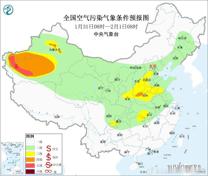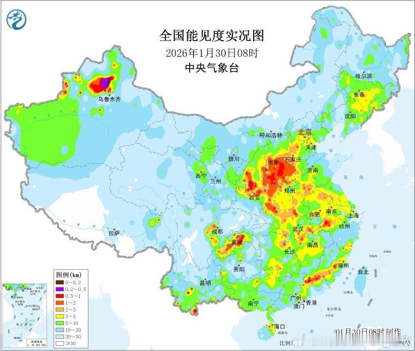 【雾和霾】今晨在新疆天山附近出现了雾和霾混杂的情况。8时能见度:霍尔果斯53米、呼图壁61米、昌吉62米、蔡家湖71米、霍城75米、阜康92米,出现强浓雾。从空气质量看,天山北麓部分站点出现重污染。另外在山西一带,依然有霾对应的污染。今明霾会减少,但2月1日以后,华北黄淮等地霾还会发展增多。