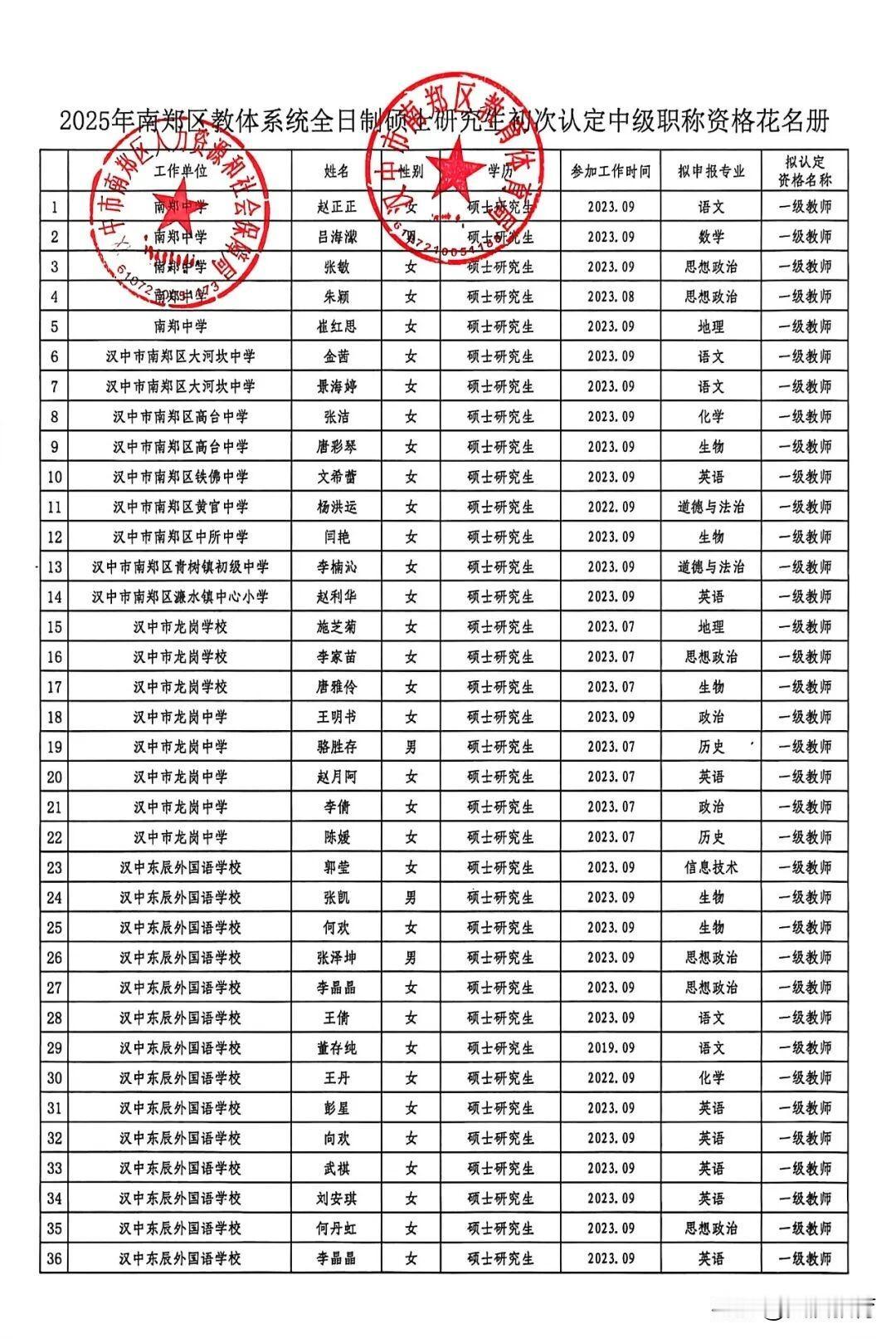 2025年南郑区教体系统全日制硕士研究生初次认定中级职称的公示