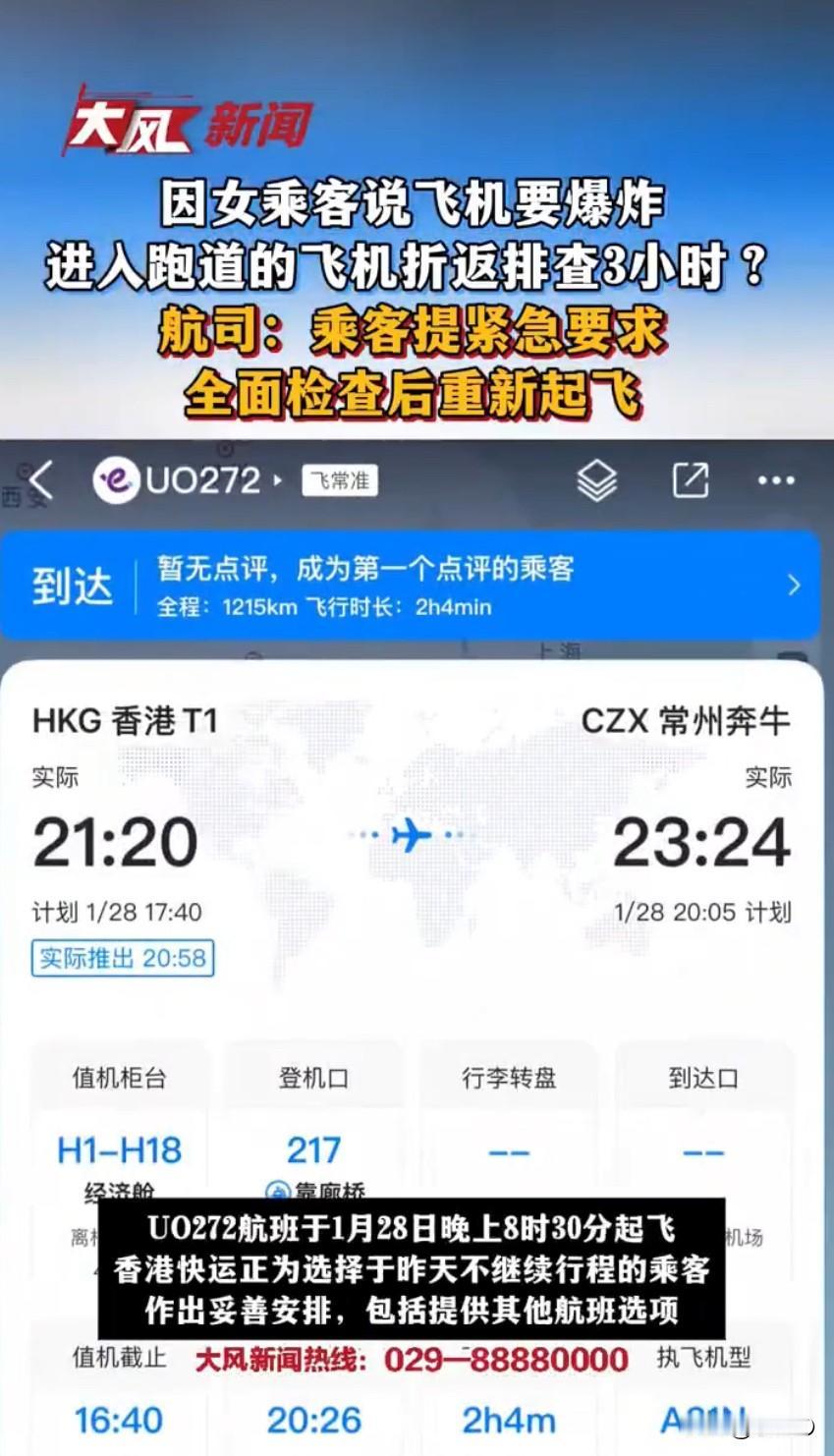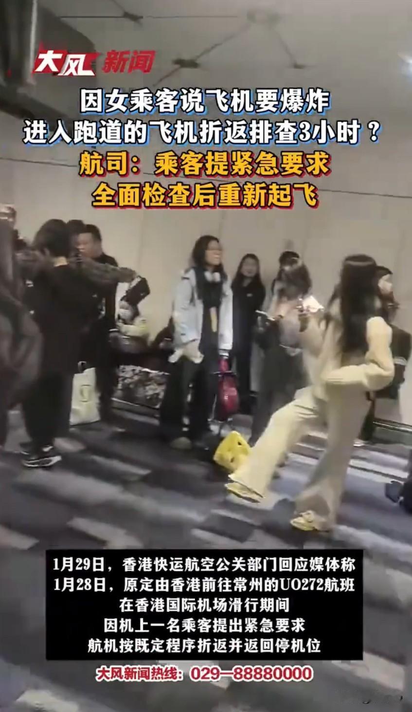一趟从香港飞往常州的航班,在滑行准备起飞时突然上演了一场“惊魂插曲”,起因是一名女乘客突然喊出“飞机要爆炸”,还坚持要求下机,直接让全机乘客的行程被打乱,延误了三个多小时。事情的经过其实不复杂,一架从香港飞往常州的航班都已经滑进起飞跑道了,马上就要起飞的时候,机上一名女乘客突然说“飞机要爆炸”,还执意要求下机,这话一出口,机舱里瞬间就不淡定了,毕竟飞机上的安全问题可是天大的事,没人敢掉以轻心。机组人员只能按照规定程序,让飞机折返回到停机位,然后安排所有乘客都下机,重新进行全面的安全检查,涉事的女乘客当场就被警方带走调查了。据同航班的网友爆料,这场风波直接导致航班延误了三个多小时,原本计划傍晚起飞的航班,直到晚上才重新出发,最终深夜才抵达目的地,更让人意外的是,有四分之一的旅客因为心里发怵,干脆放弃了这趟行程,其中有15位乘客明确表示“不敢坐了”,宁愿后续再重新安排出行,还有网友透露,被带走的女乘客后来并不承认自己说过“飞机要爆炸”的话,反而声称是自己被人跟踪,才会有那样的举动。之后航空公司也对此事做出了回应,说航班滑行时因为一名乘客提出紧急要求,才按既定程序折返,之后已经安排所有乘客重新安检,飞机也做了全面检查,确认安全后才安排起飞的,对于那些放弃行程的乘客,也会提供其他航班选项等妥善安排,其实懂行的人都知道,航空安全可是天大的事,不管乘客说的是真是假,机组人员都得按流程来排查,毕竟要对全机人的安全负责,不能有半点马虎。不过这事也引发了网友的热议,大家纷纷吐槽这名女乘客的行为,说她这简直是“一句话搅黄一飞机人的行程”,就算是被跟踪,也不该在飞机上喊这种引发恐慌的话,而且根据相关规定,编造或者故意传播涉及民航空防安全的虚假恐怖信息,可是违法行为,轻则会被行政处罚,重则可能还要负刑事责任,甚至会被列入民航失信名单,以后坐不了飞机。现在大家出门坐飞机都图个平安顺利,这种突发状况不仅耽误时间,还容易引发不必要的恐慌,虽然目前警方还没公布最终的调查结果,但不管这名女乘客是出于什么原因,这种影响公共安全和公共秩序的行为都不可取,毕竟飞机上每个人的安全都不容忽视,可不能因为个人行为给大家带来麻烦。女乘客称飞机要爆炸要求下机 多方回应乘客称飞机要爆炸致延误 香港机场事件 来源:大风新闻