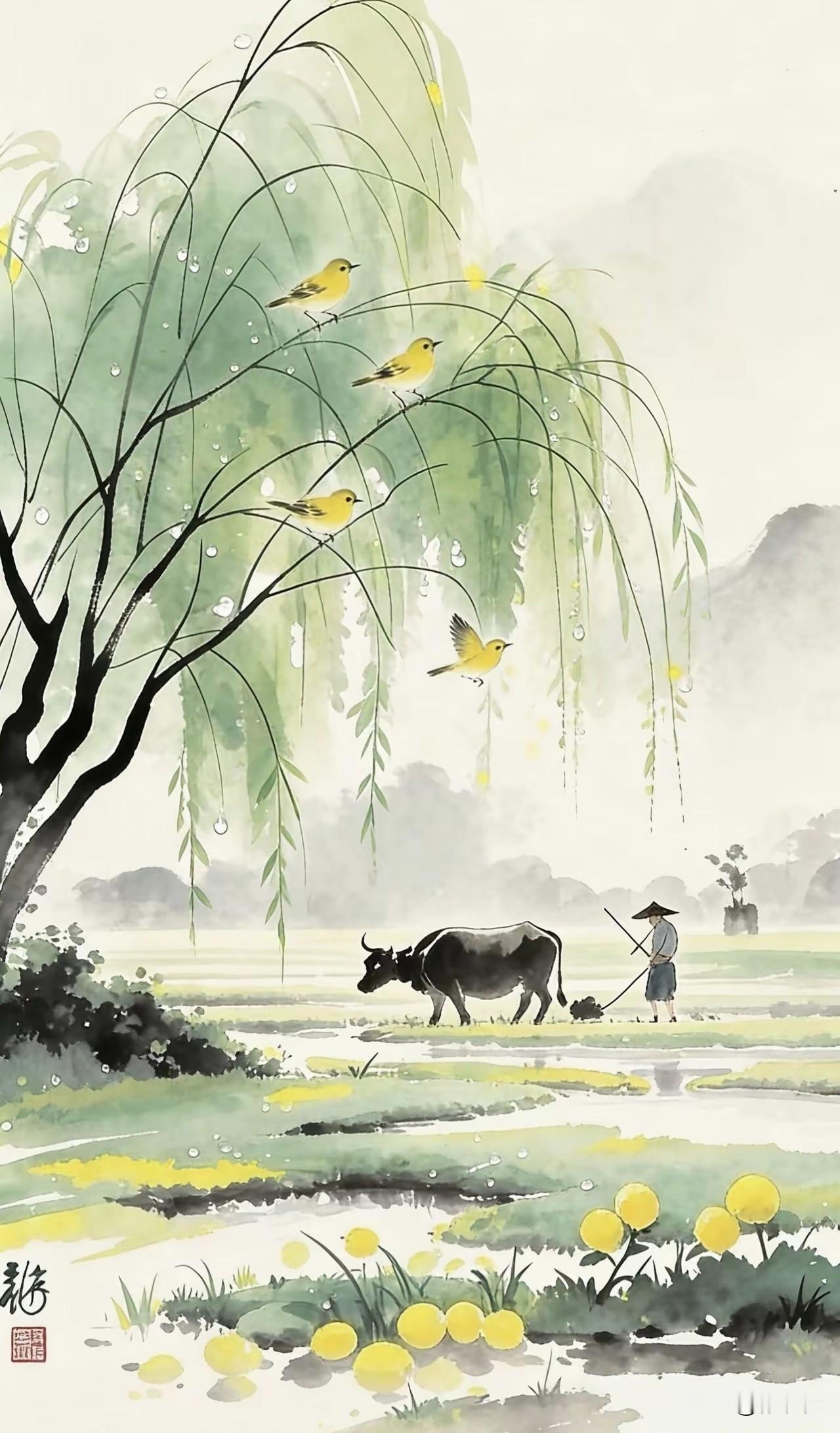 柳丝拂水燕低翔, 田野耕牛步韵长。 风送花香盈小径, 几只黄鹂歌声扬。