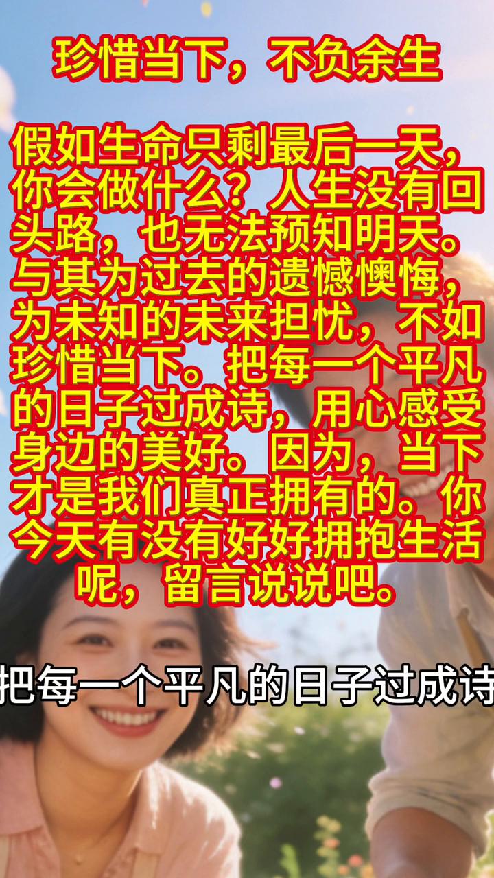 珍惜当下,不负余生。 假如生命只剩最后一天,你会做什么?人生没有回头路,也无法预知明天。与其为过去的遗憾懊悔,为未知的未来担忧,不如珍惜当下。把每一个平凡的日子过成诗,用心感受身边的美好。因为当下才是我们真正拥有的。 你今天有没有好好拥抱生活?留言说说吧。